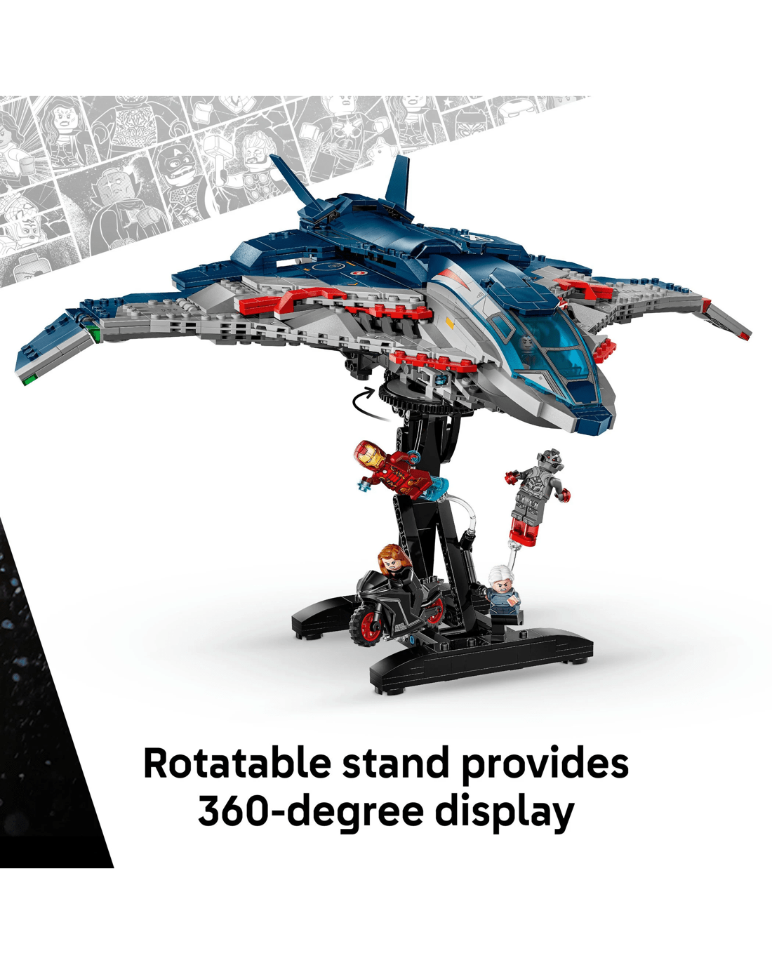 - 360-deg. display - A removable, rotatable stand is provided so the authentically detailed Quinjet can be admired from all angles
