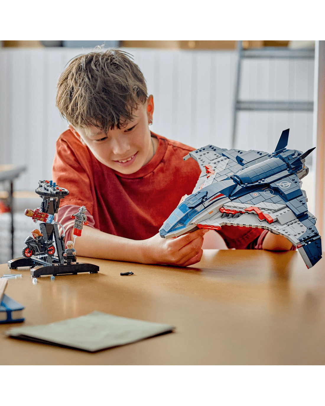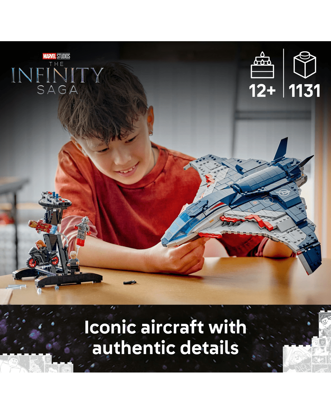 - 1,131-piece kids' building kit - The Quinjet on its stand measures over 28cm high, 30cm long and 45cm wide