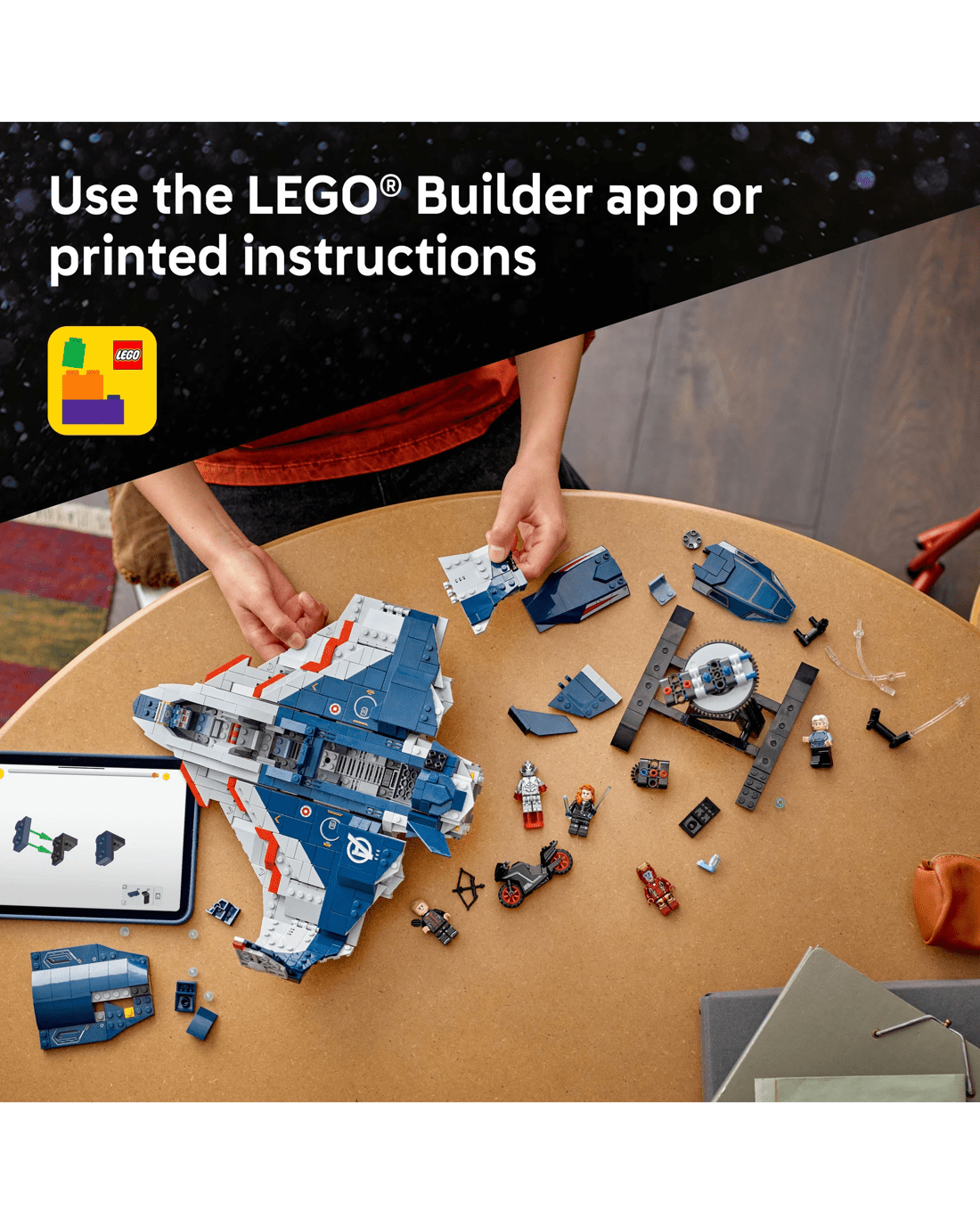 The Quinjet features an opening cockpit, two stud shooters at the front and storage for Black Widow's weapons and Hawkeye's bow. The rear door opens so kids can drive the motorcycle in and out. A removable, rotatable stand is included to provide a 360-deg. display of the iconic aircraft. For added digital fun, builders can zoom in, rotate models in 3D and track their progress using the fun, intuitive LEGO Builder app. Contains 1,131 pieces.