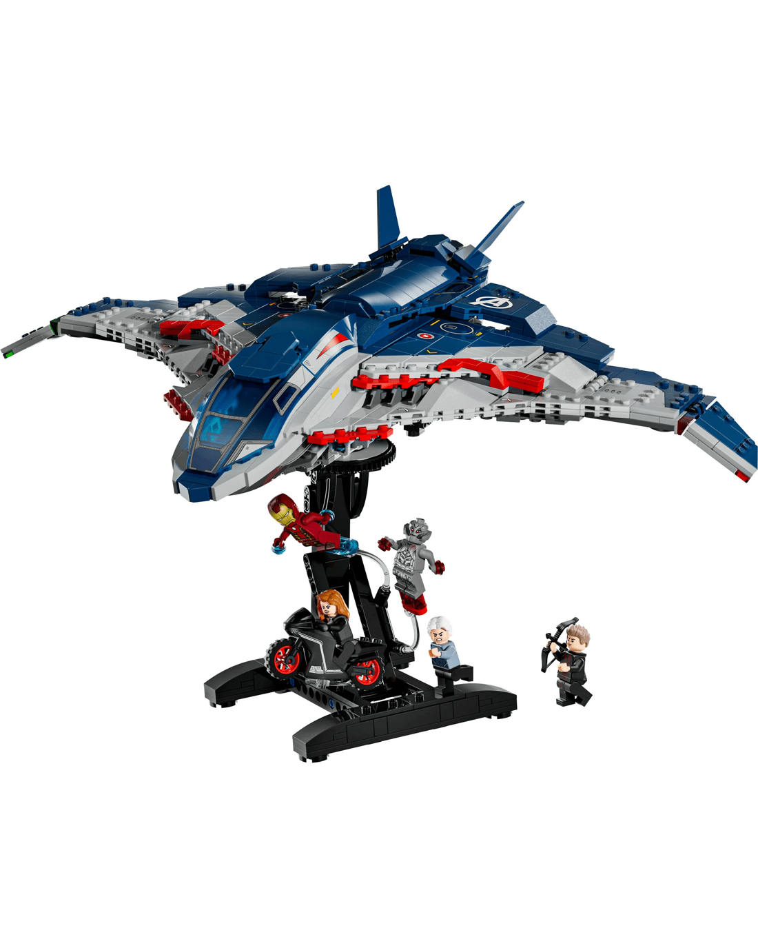 The buildable Quinjet model comes with five minifigures: Black Widow with her motorcycle, Iron Man, Quicksilver, Ultimate Ultron and Hawkeye with his bow and arrow. The minifigures can be attached to multiple locations on the aircraft.