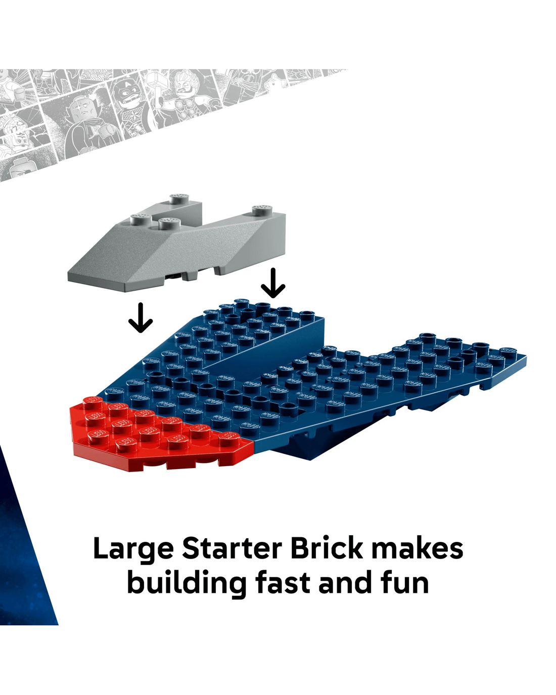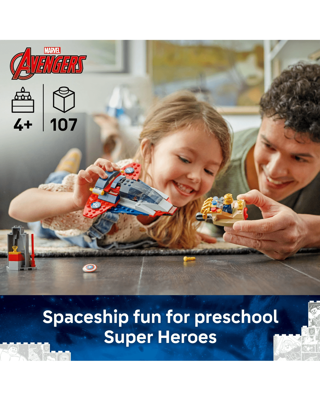 The build-and-play toy includes two minifigures: Thanos in a spaceship designed to look like his Infinity Gauntlet, with moving 'fingers' and a missile launcher and Captain America, in a super-sleek Quinjet with two shooters, an opening cockpit and a hidden compartment for his shield. A separate build features a cosmic stone to inspire imaginative play as Captain America attempts to stop Thanos stealing the precious gem. Inside the box, each bag contains bricks and a large Starter Brick for a fast-to-build model and character so play can start quickly. Intuitive instructions are provided in the form of a colourful booklet. Contains 107 pieces.