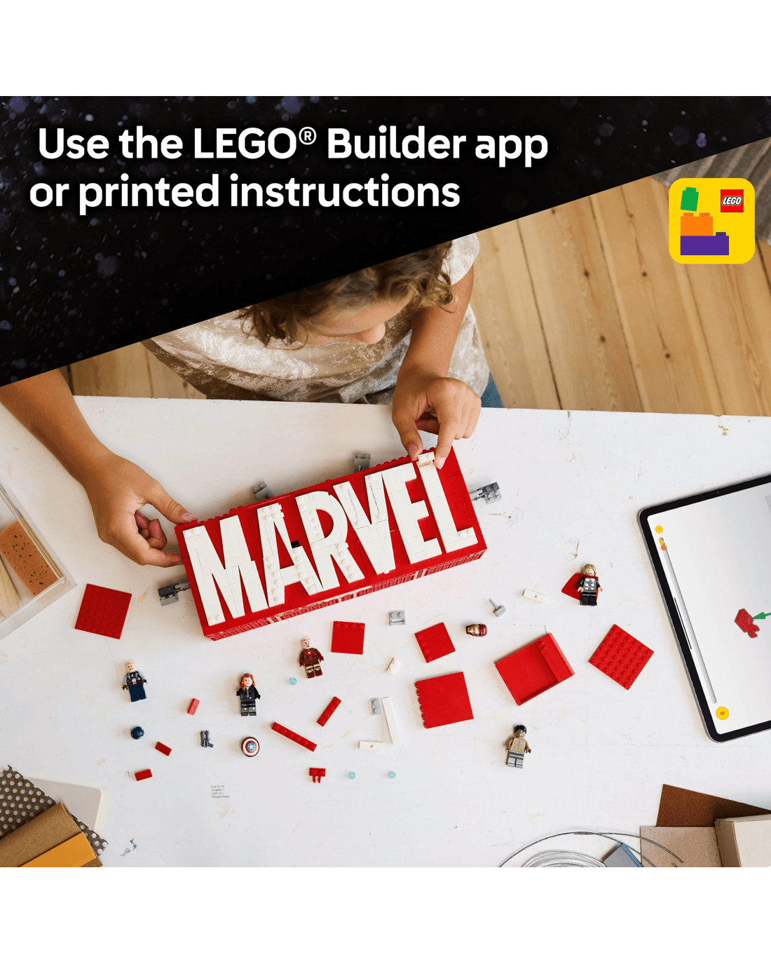 The buildable Marvel logo set is assembled using bold red and white bricks. Kids press three separate buttons on the top of the logo to make Hulk, Thor, Iron Man, Black Widow and Captain America minifigures burst from the Marvel model, bringing Avengers action to life right before their eyes. Each minifigure easily returns to its original position. For added digital fun, builders can zoom in, rotate models in 3D and track their progress using the fun, intuitive LEGO Builder app.