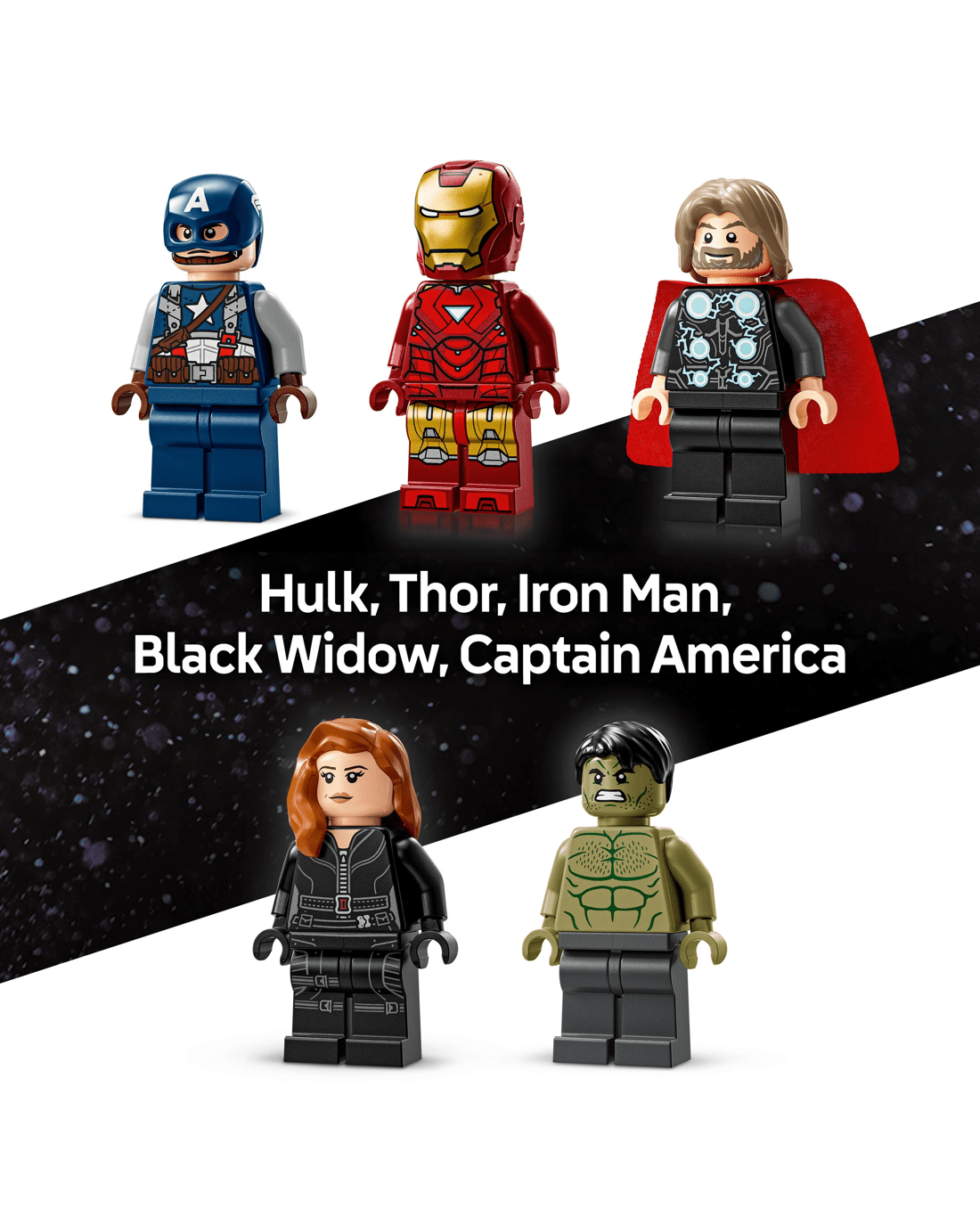 - LEGO Marvel minifigures - The buildable set contains Hulk, Thor, Iron Man, Black Widow and Captain America minifigures with accessories