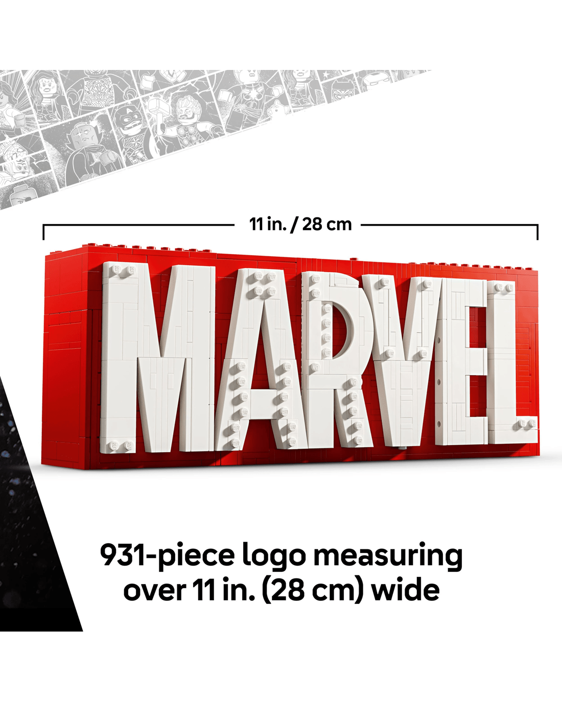 - 931-piece Marvel logo set - In its closed position, the Marvel model measures over 11cm high, 28cm wide and 7cm deep