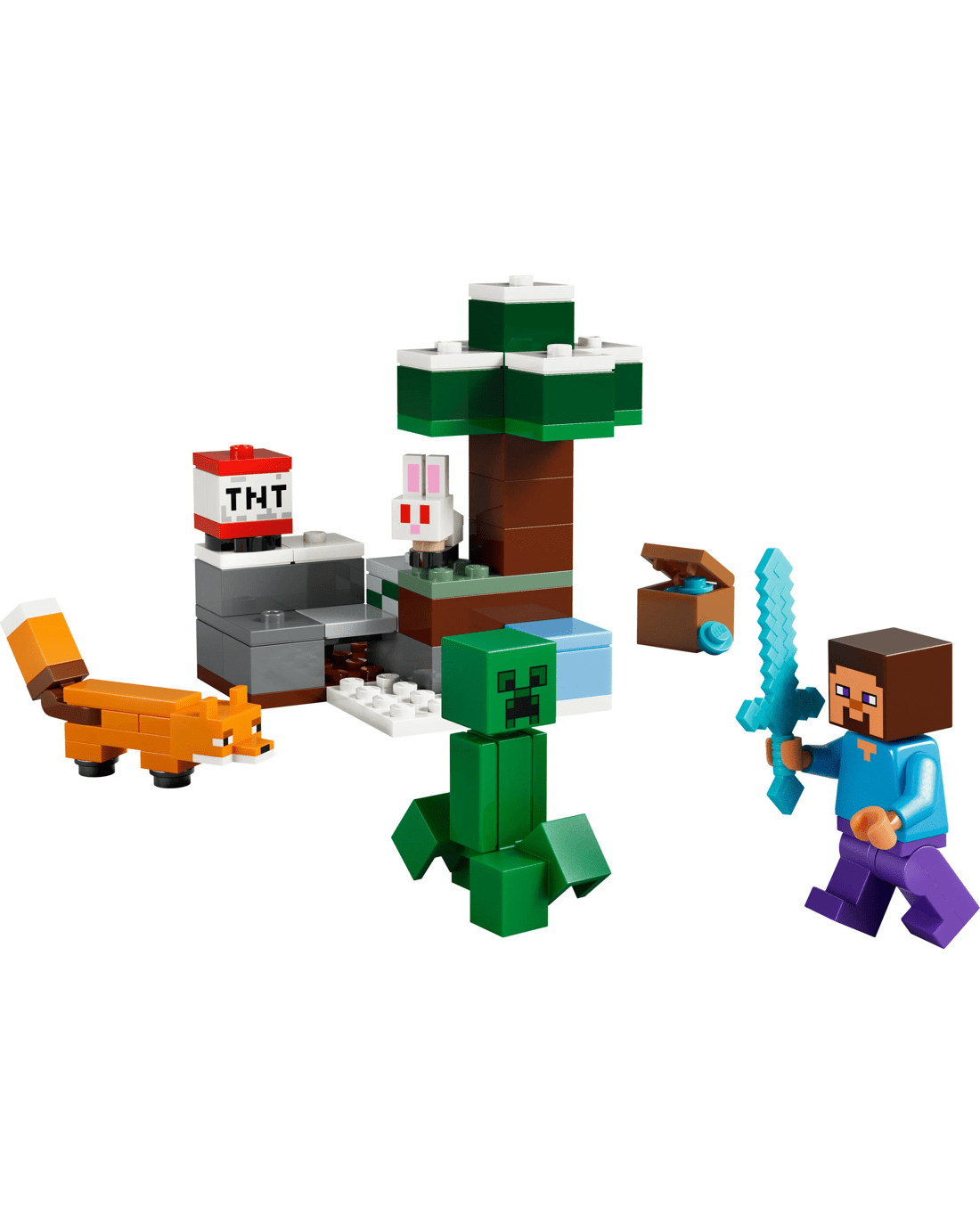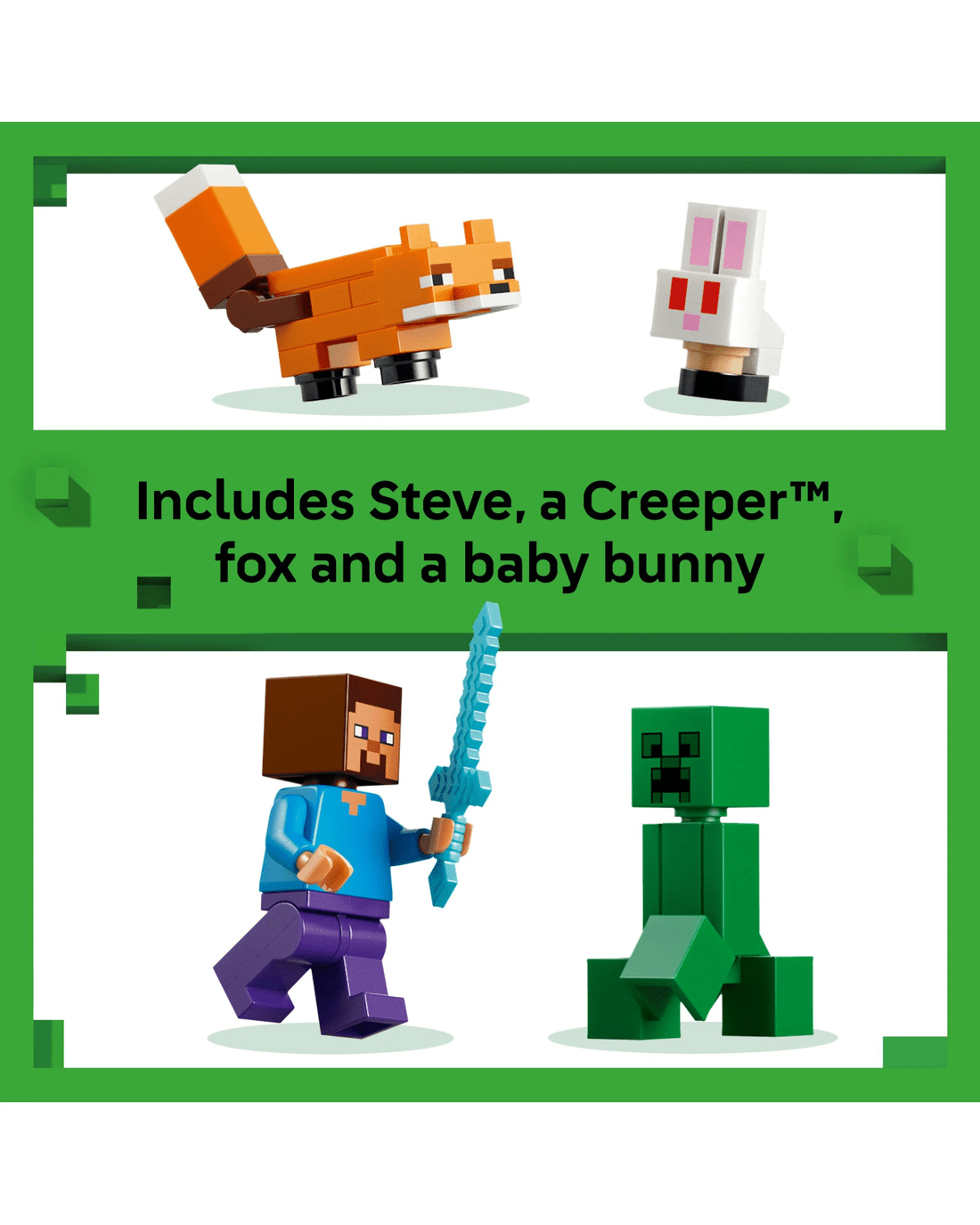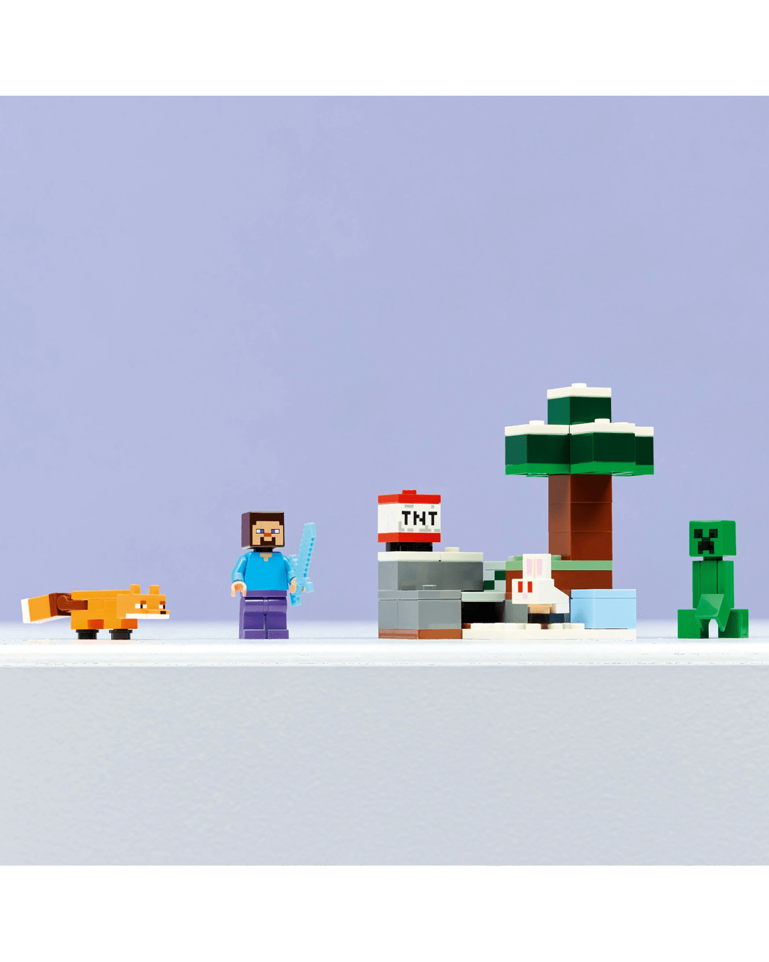 - 4 LEGO Minecraft Characters - Build adventures set in the taiga biome with a Steve minifigure, plus a Creeper and 2 Minecraft animal figures, a fox and a baby bunny