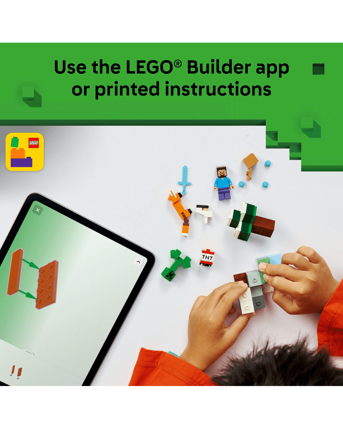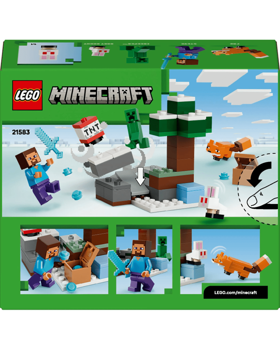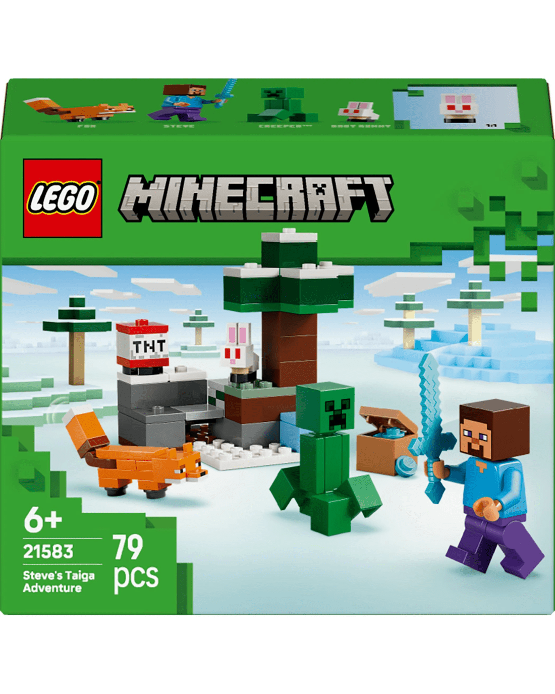 - 4 LEGO Minecraft Characters - Build adventures set in the taiga biome with a Steve minifigure, plus a Creeper and 2 Minecraft animal figures, a fox and a baby bunny