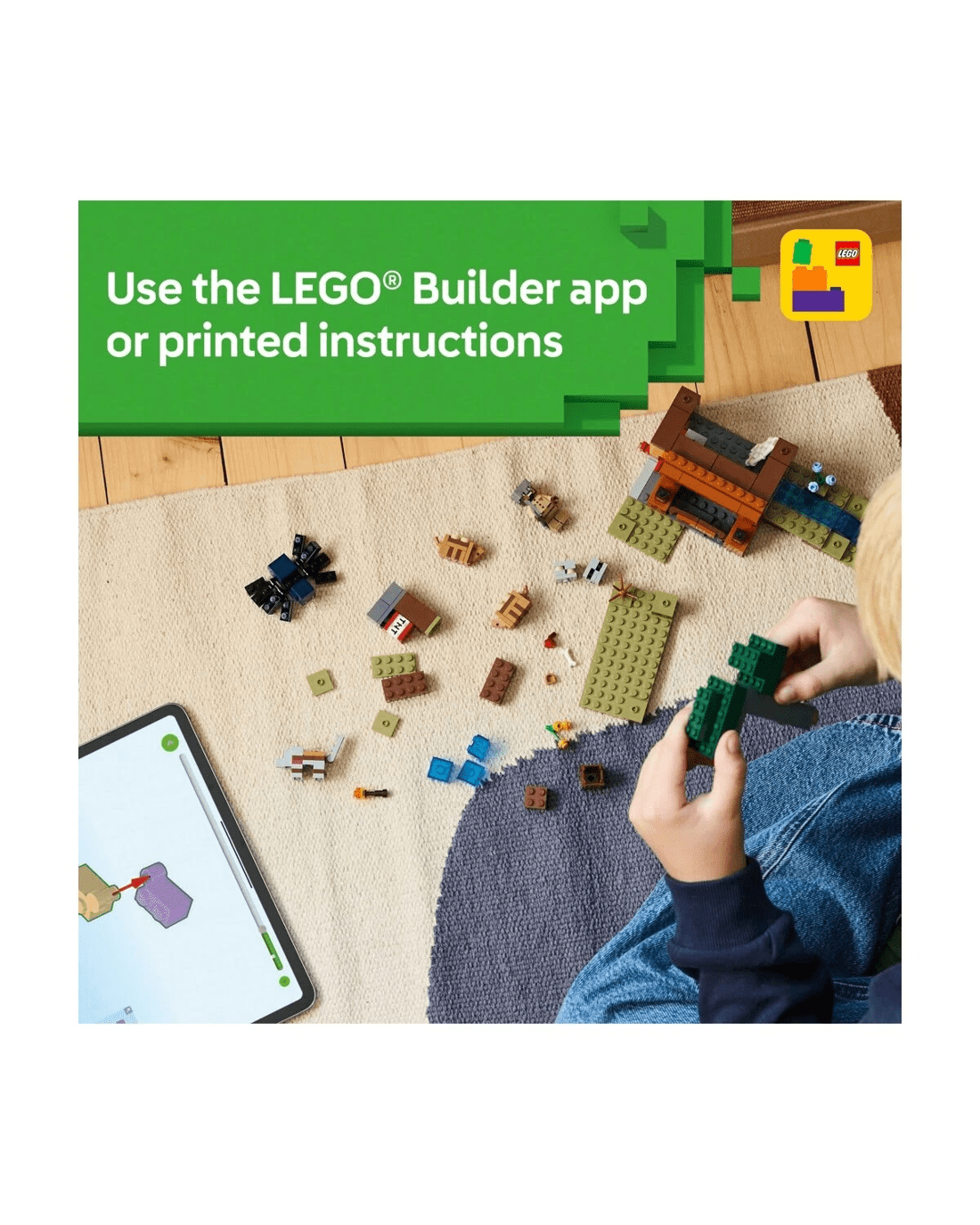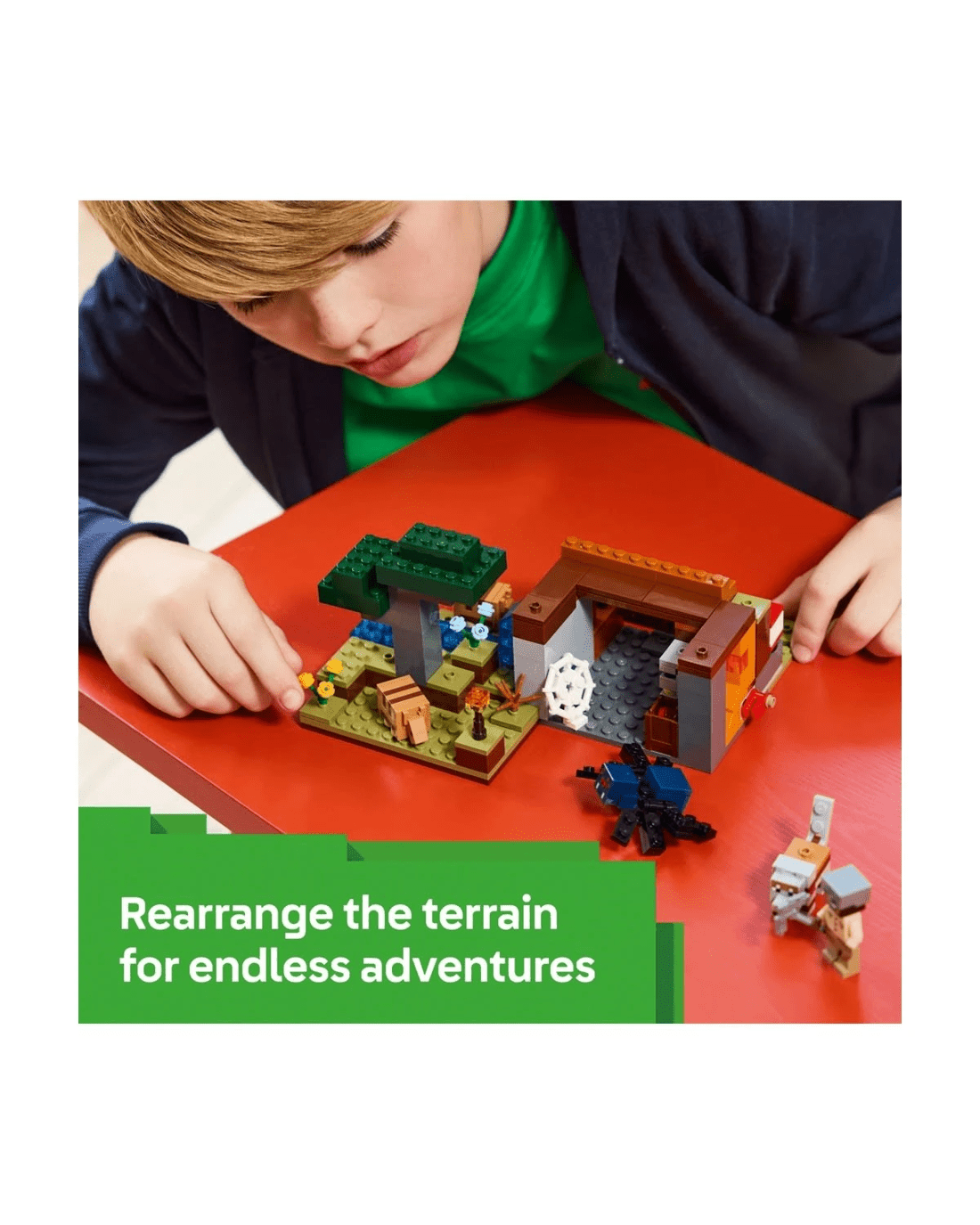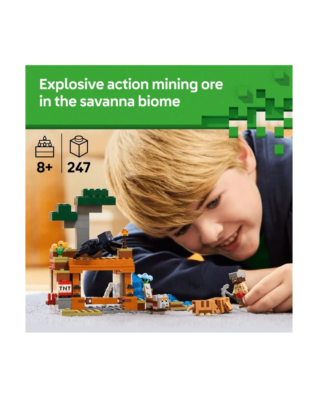 Set in the game's savanna biome, the model features a mine with a lever-controlled TNT function that blasts away a piece of the terrain to reveal precious ore. There is a cave spider toy and a wolf, plus two armadillos, which provide the scutes used to craft wolf armour. At the side of the mine there is a small river and a lava fall. The set easily rearranges to inspire new adventures. For extra digital fun, the LEGO Builder app lets kids zoom in and rotate models in 3D using their device.
