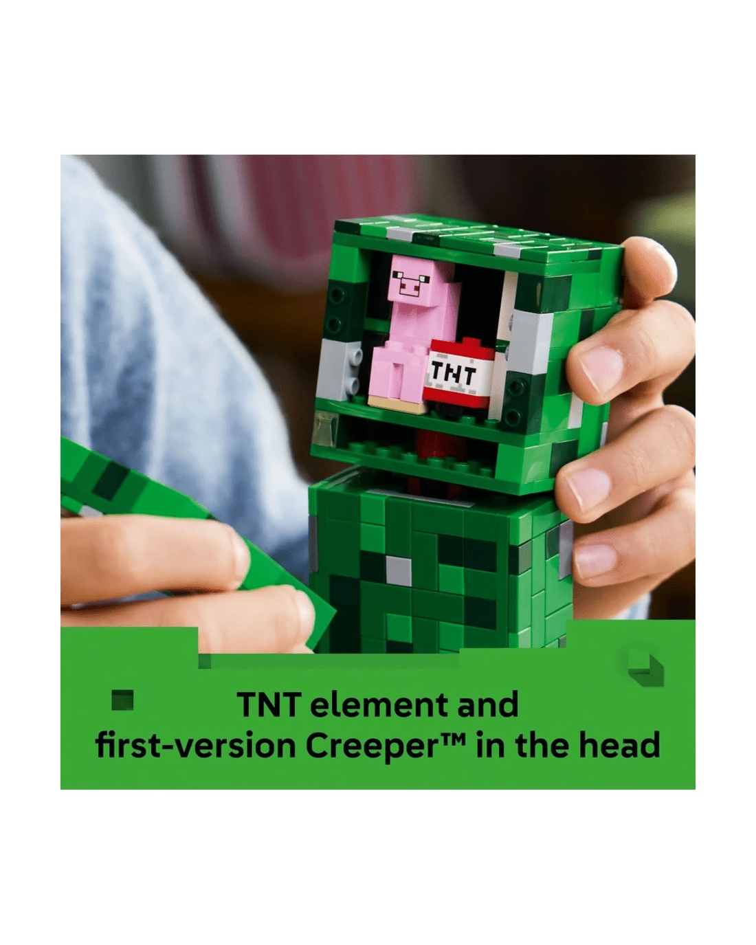- A hidden surprise - The front of the LEGO Minecraft Creeper figure's head detaches to reveal an interior space containing a first-version Creeper minifigure and a TNT element