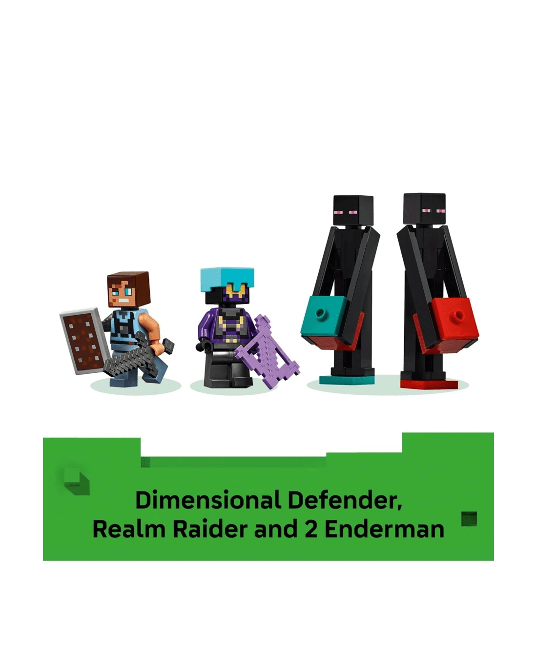 - Collectible video game figures - The set features a Dimensional Defender, a Realm Raider, 2 Enderman minifigures and 2 Endermite mob figures, and an enchanted crossbow and a netherite sword and shield