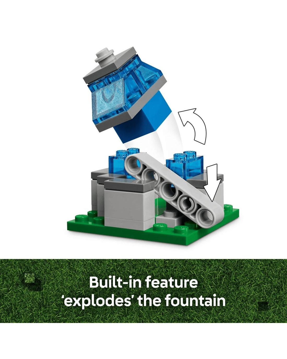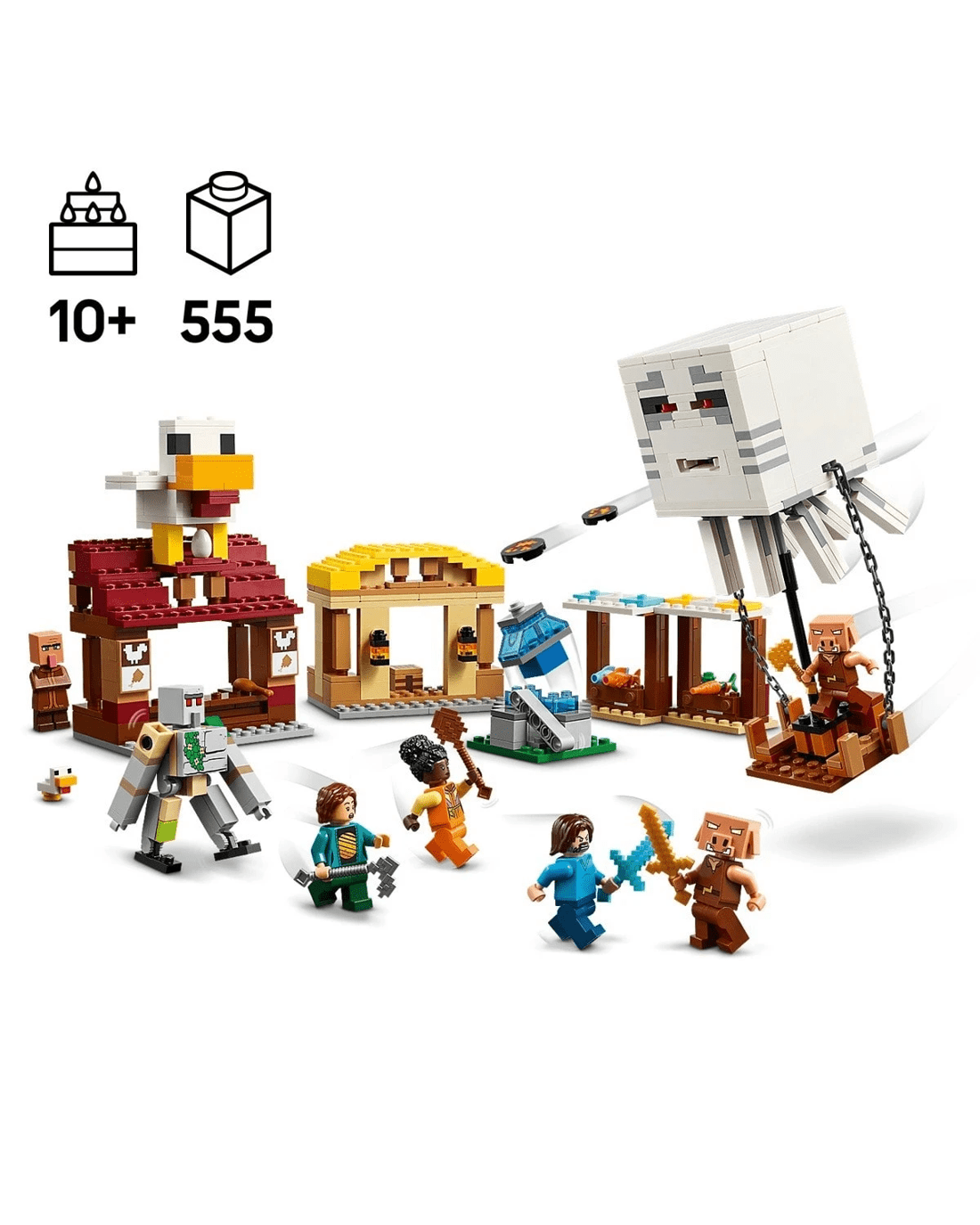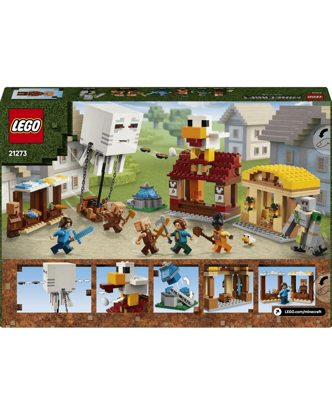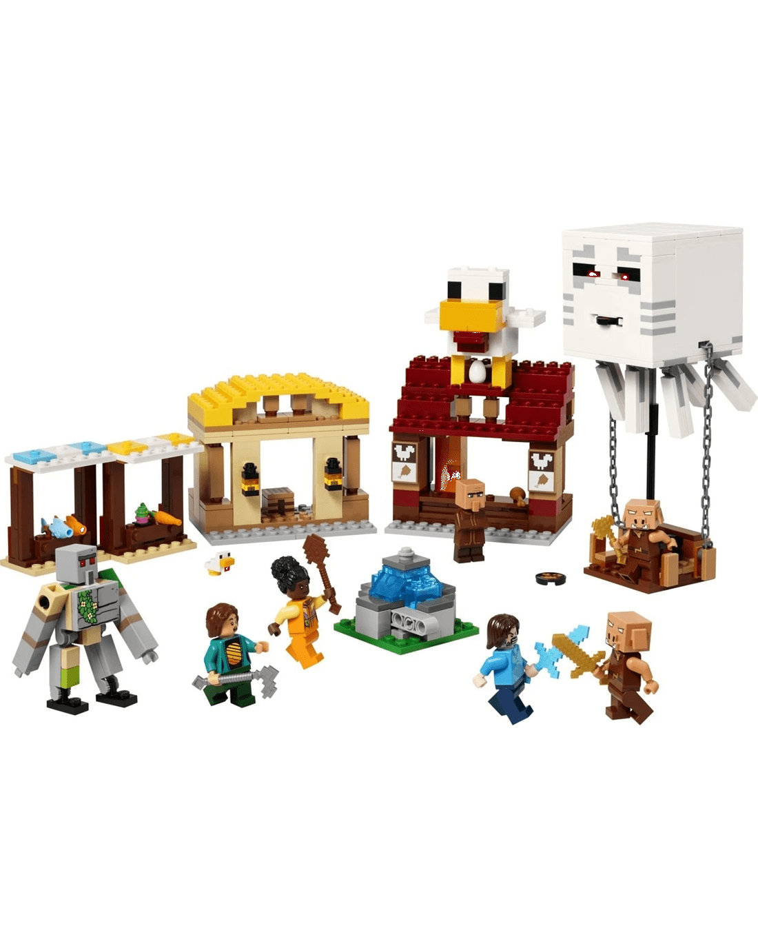 - Video game LEGO set - When piglins launch missiles from their ghast balloon, causing the fountain to 'explode', kids must defend the villagers and Steve's fried chicken restaurant and crafting shack
