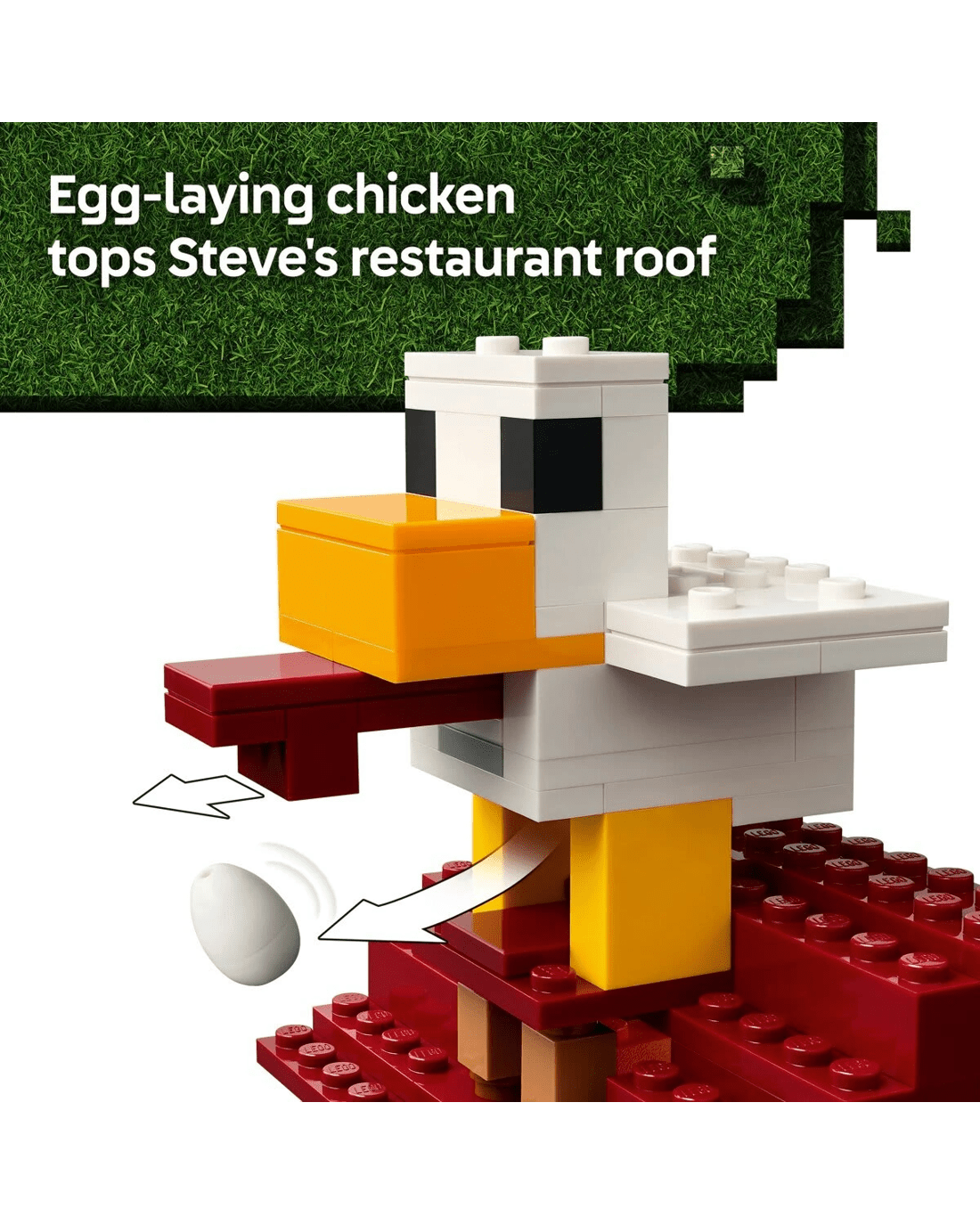 The set features popular characters from the video game: Steve, Natalie, Dawn, two piglins, a ghast balloon, villager, baby chicken and a posable iron golem figure. The balloon has room for the piglins and incorporates a disc shooter. Set amongst the village are market stalls, Steve's fried chicken restaurant, his crafting shack and a fountain, which kids can 'explode' using a built-in feature. The restaurant’s roof is topped with a large chicken model that includes a fun egg-laying function. For digital fun, the LEGO Builder app lets kids zoom in, rotate models in 3D and track their progress.