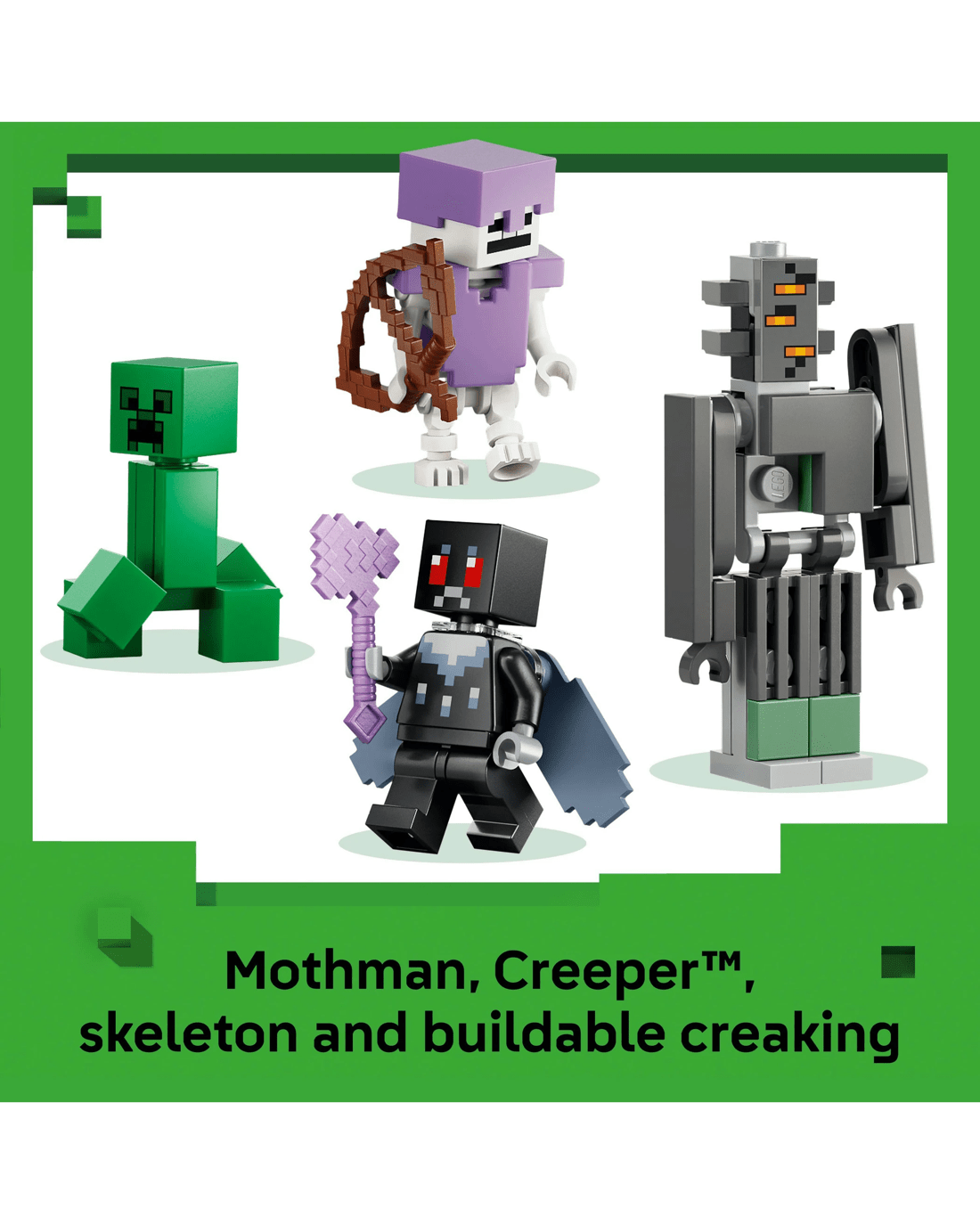 - 4 LEGO Minecraft Characters - A brick-built creaking takes on the heroic, winged Mothman while a Creeper and skeleton prowl around the pale garden biome