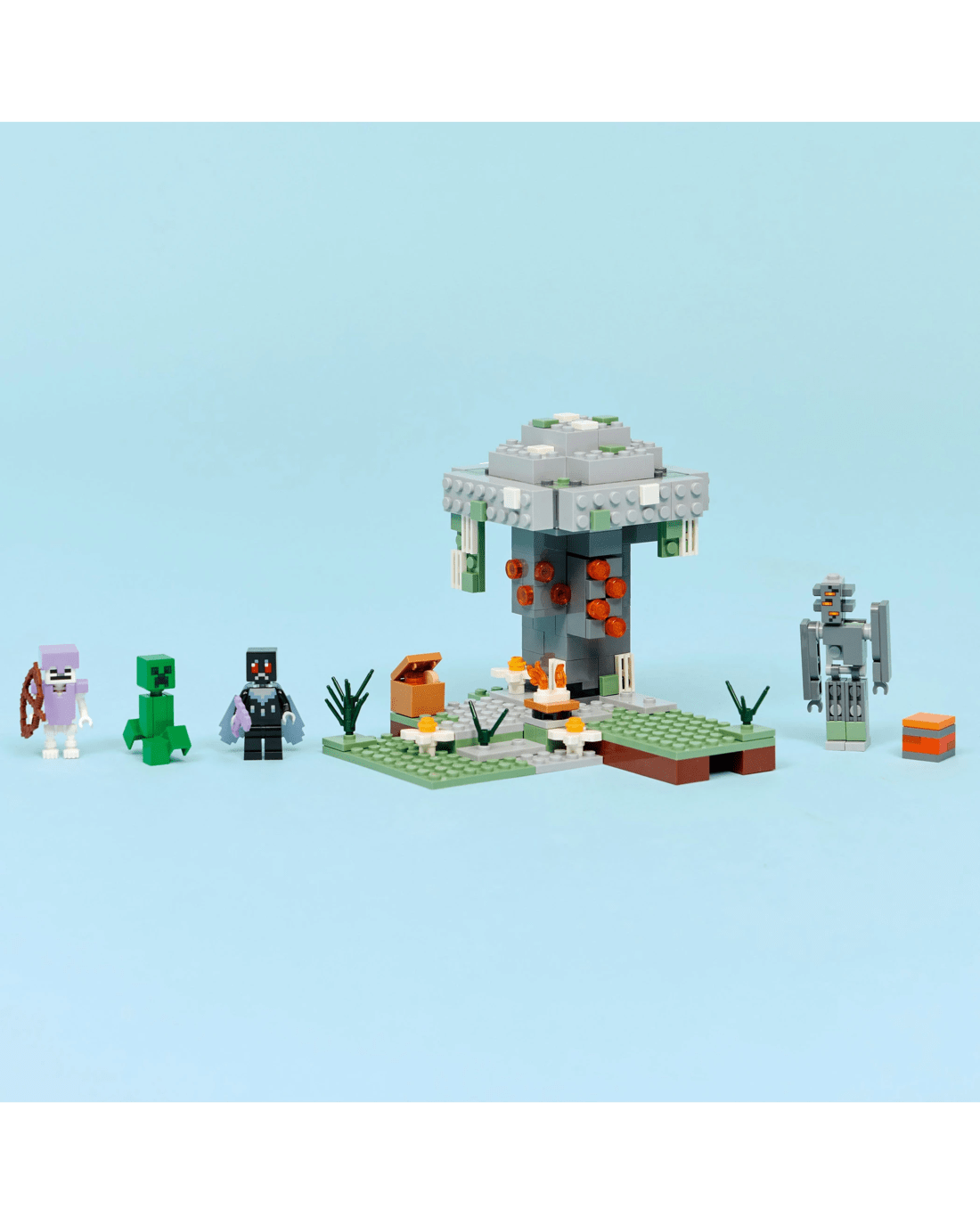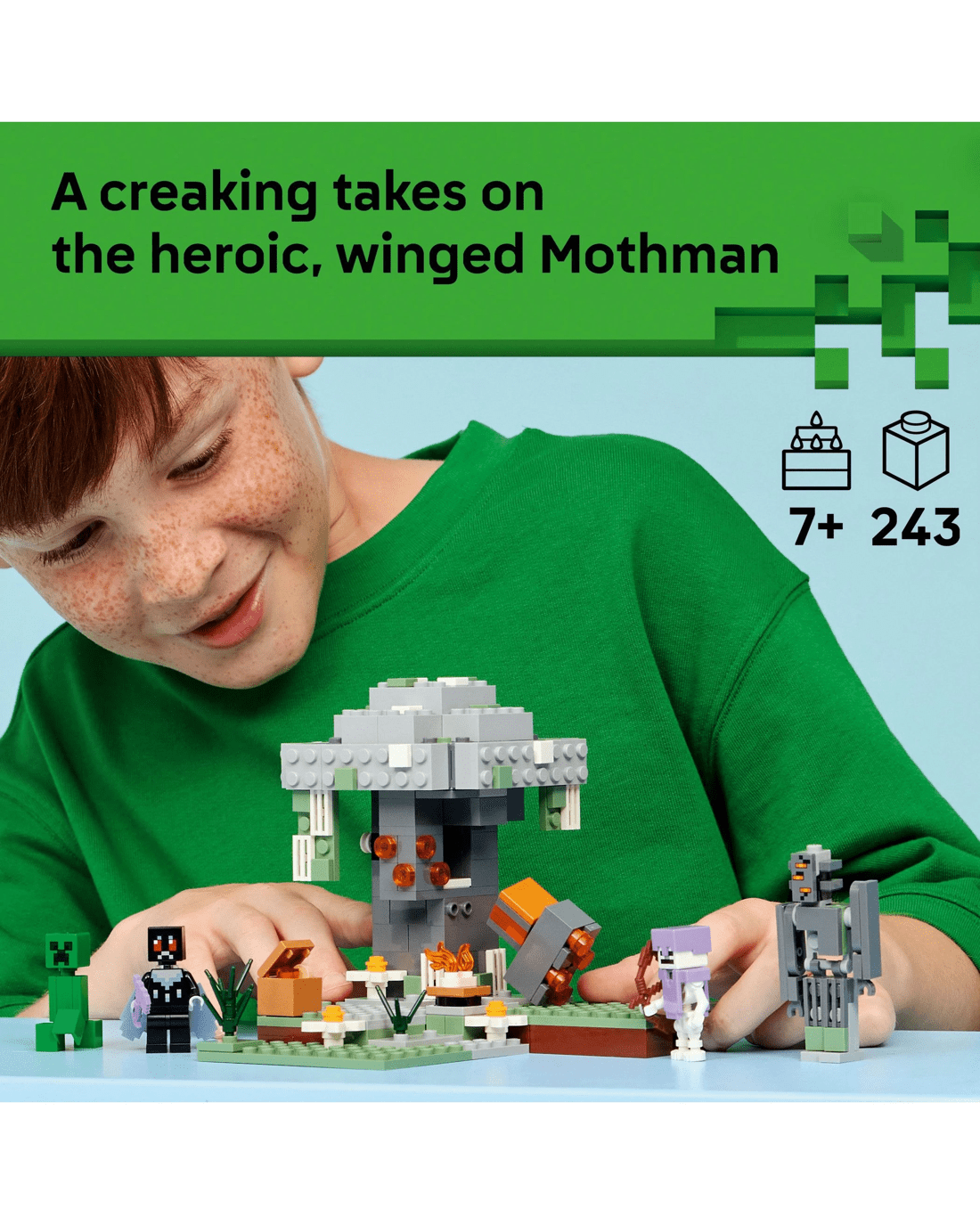 Gamers can enter one of the Minecraft game's weird and wonderful biomes with The Pale Garden LEGO building set toy for boys and girls. A brick-built creaking takes on the heroic, winged Mothman while a Creeper and skeleton prowl around the pale garden biome.