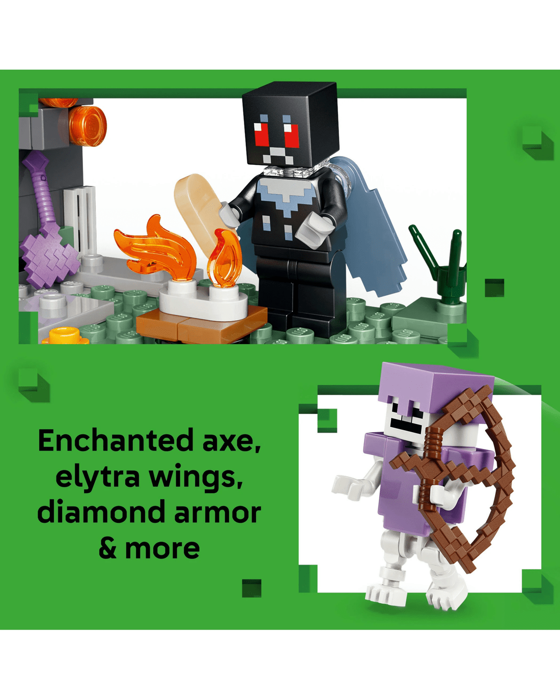 - Authentic Accessories - Gaming action is brought to life with Minecraft merchandise, including an enchanted axe, bow, storage chest, campfire, porkchop, elytra wings, diamond armour and resin clumps