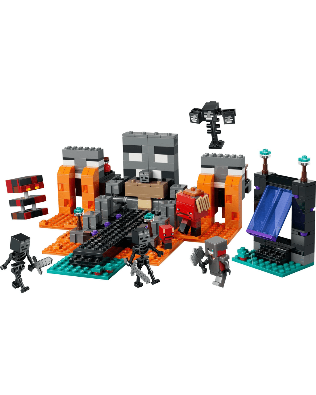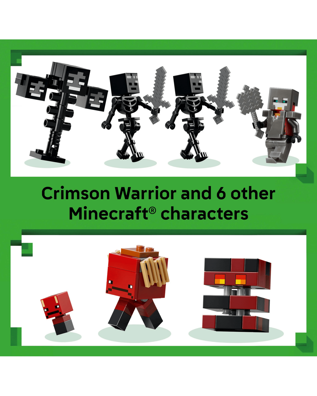 - 7 Minecraft Characters - Join a Crimson Warrior and 2 wither skeleton mob figures, plus a strider, baby strider, wither and magma cube mob figures, in the LEGO Minecraft Wither Battle