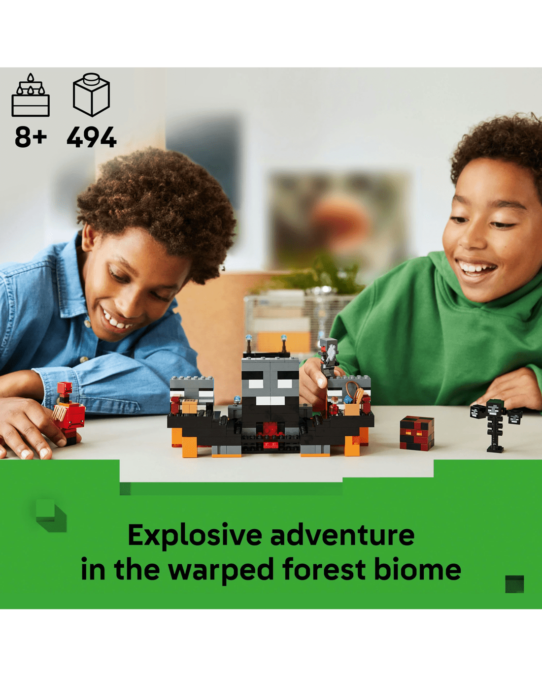 Transport Minecraft players to endless pretend-play possibilities with the Wither Battle building toy for boys and girls. Kids join the Crimson Warrior as he takes on two skeletons and other mob figures in an explosive adventure in the warped forest biome.