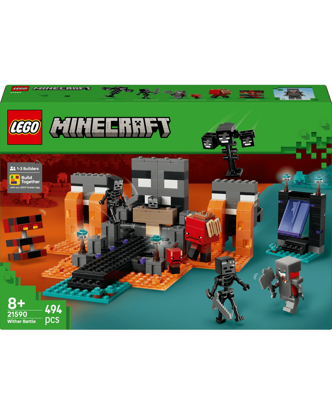 Packed with action and authentic Minecraft details, this set includes gaming characters like a Crimson Warrior, two wither skeletons, a strider, a magma cube and a buildable wither boss. A Nether portal and a shrine with a crafting table and a hidden wither that kids can summon with an explosion feature bring the game to life. Kids enjoy imaginative, hands-on play as they battle foes, ride the strider and engage in epic adventures - making it a great gamer gift for Minecraft players, LEGO builders and fans of video game toys. And friends and family can team up with Build Together mode in the LEGO Builder app, where everyone has fun building part of the set using their own devices. Set contains 494 pieces.