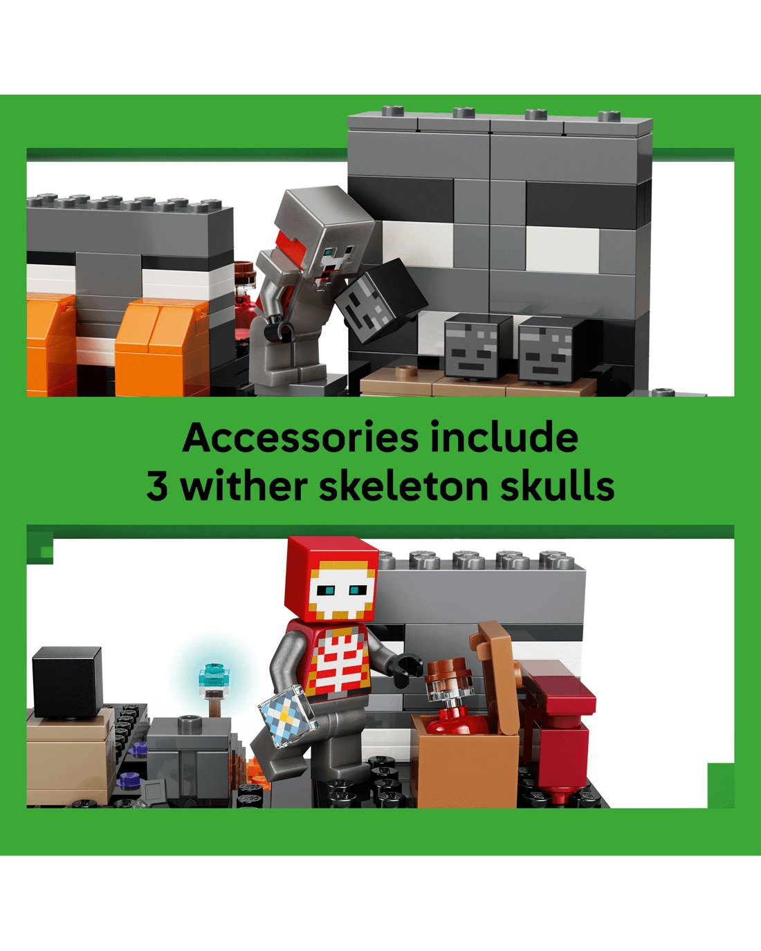 - Battle Action Accessories - A crafting table, health potion, mace, 3 wither skeleton skulls, a stick holding warped fungus and a precious Nether star help to inspire kids' imaginative play