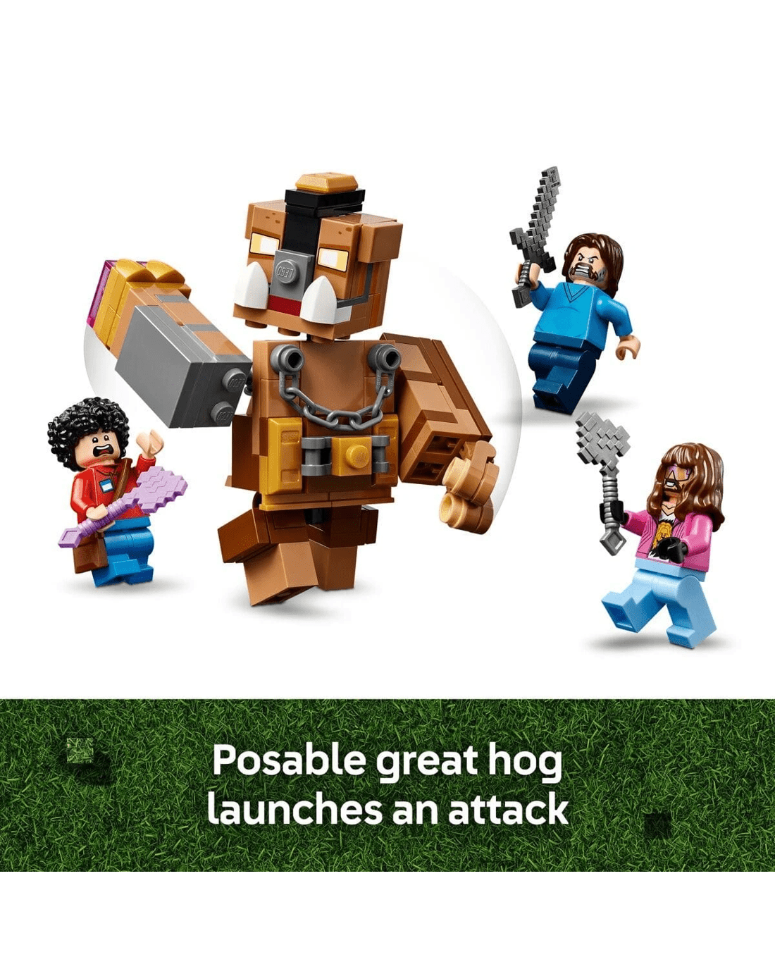 The LEGO Minecraft building set features toy figures from the film - Steve, Garrett, Henry, a baby zombie, a chicken jockey and a posable great hog - plus weapons and potions that kids can use as they recreate battle scenes and explore adventures of their own. The set features a functional fighting ring with score-keepers and handles kids can attach to the fighters. There's also a mansion facade with a removable chest and weapons rack. For digital fun, the LEGO Builder app lets kids zoom in, rotate models in 3D and track their progress.