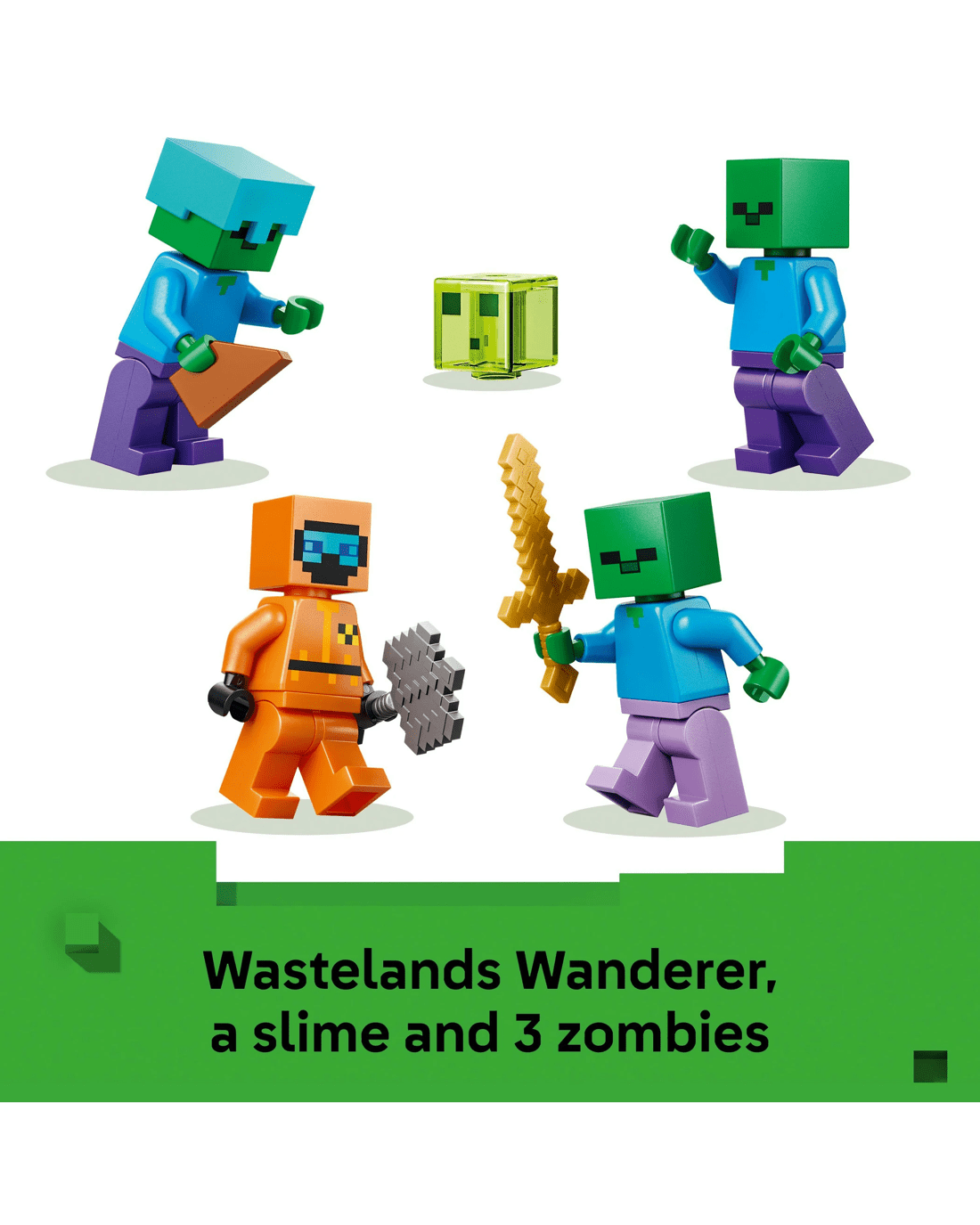 - 3 Zombie Figures - Includes a Wastelands Wanderer minifigure, a slime and 3 zombies, including one with enchanted leggings and gold sword and one with diamond helmet