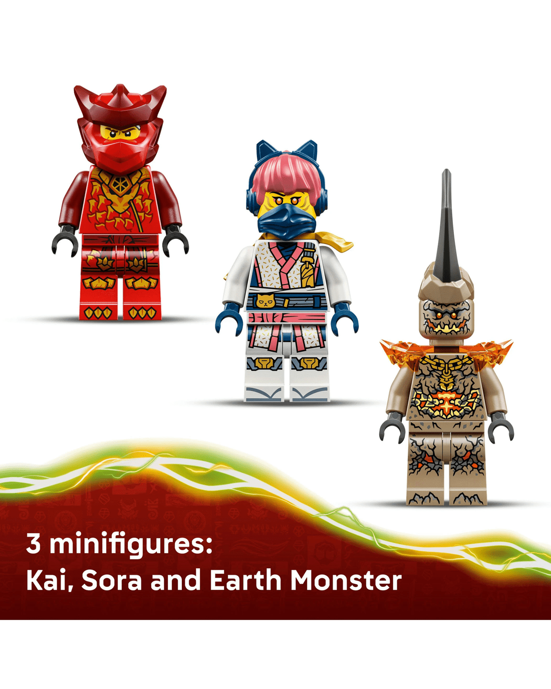 - 3 NINJAGO Minifigures - This ninja toy comes with Kai, Sora and a villainous Earth Monster for fans to play out action-packed good vs. evil battles