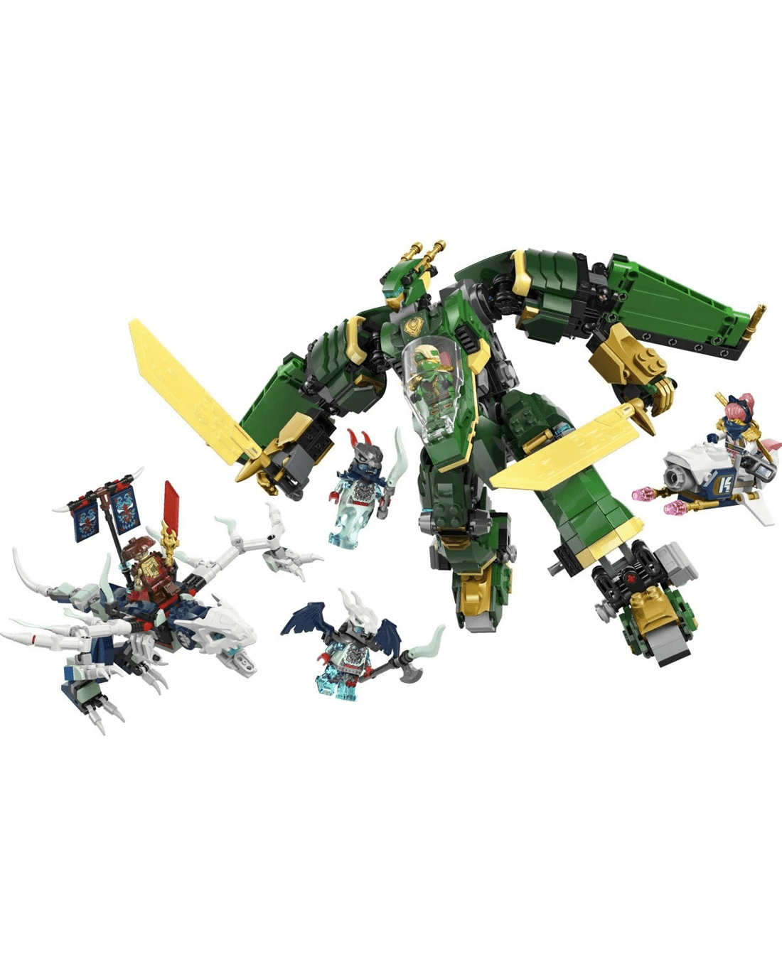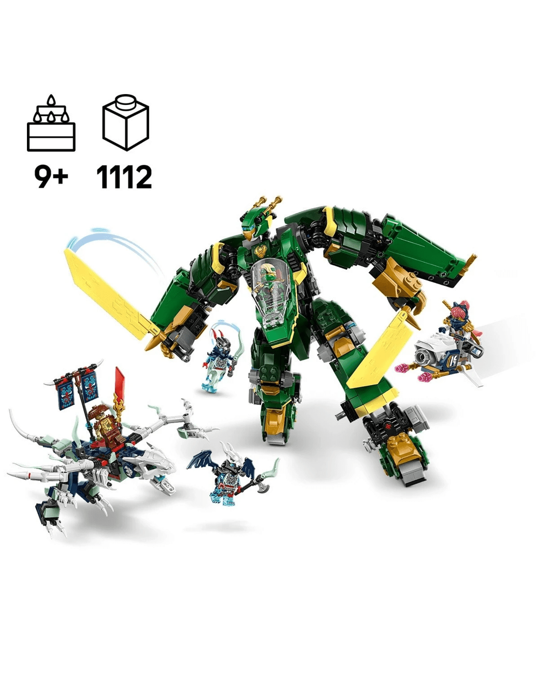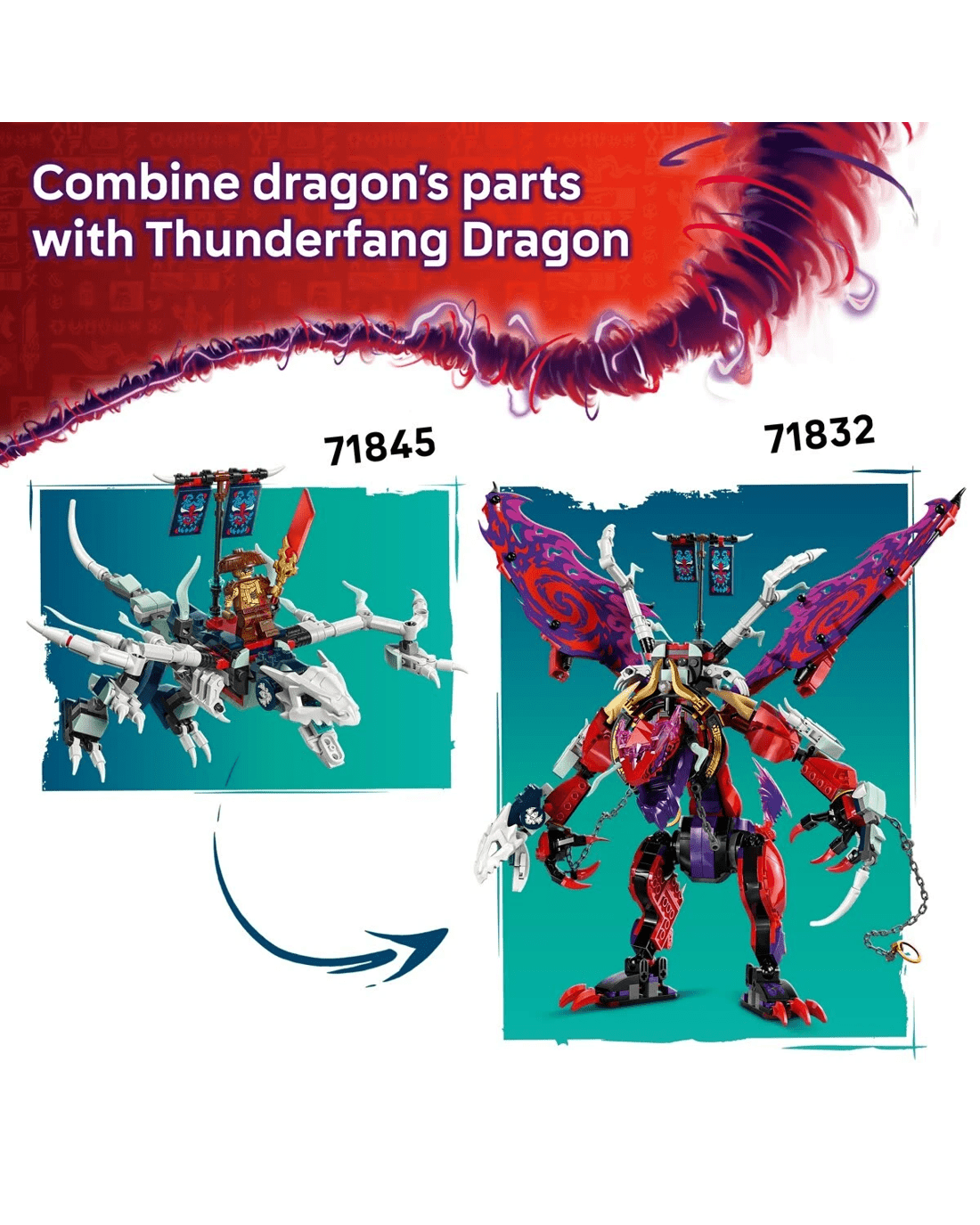 This adventure toy battle set features five minifigures: Sora and Lloyd armed with ninja weapon accessories to take on the villainous trio of Kur, Tyr and a Spectral Dragonian Warrior, who have a banner containing a secret message that can only be read using by Lloyd's translucent reveal blade. Sora has a flying motorbike toy to ride, while the villains have a posable spectre dragon toy, which can be combined with parts from the Thunderfang Dragon of Chaos playset (sold separately). Set contains 1,112 pieces.