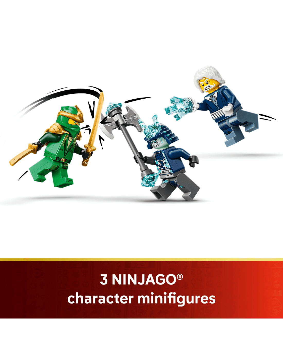 - 3 NINJAGO Minifigures - Model building kit comes with characters from the TV show: Lloyd and Grimfax, plus, for the first time ever, a collectible elemental Master of Ice on a stand with a celebration coin