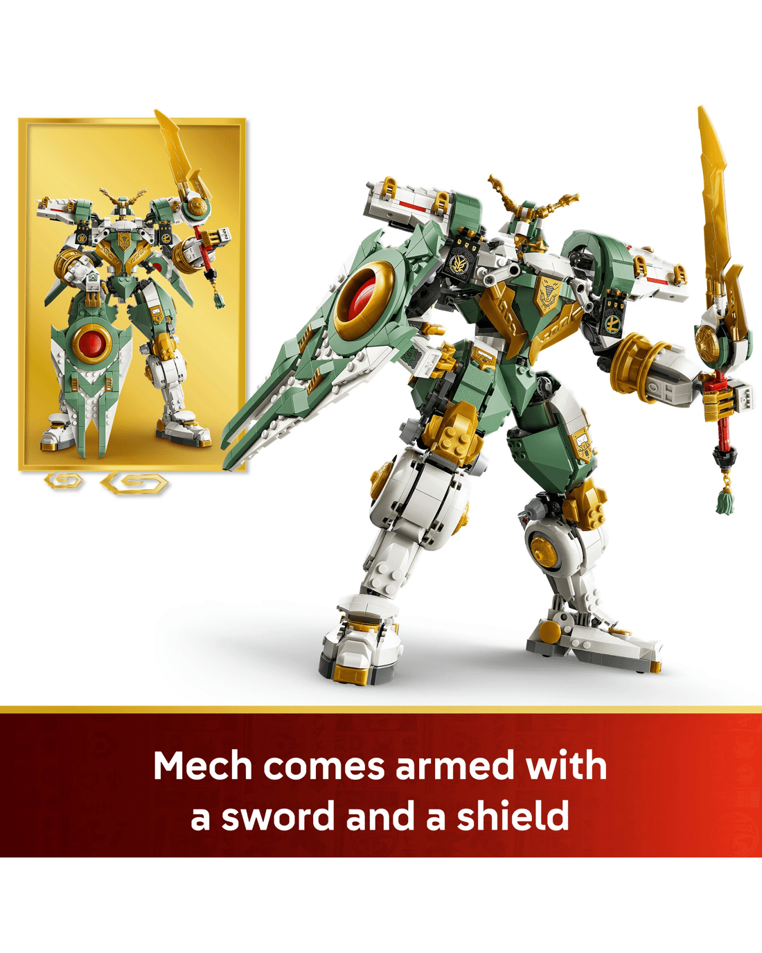 - Sword and Shield Accessories - NINJAGO mech toy is armed with a sword and, for the first time ever, a large brick-built shield that can also be repurposed and placed on the back as a pair of wings