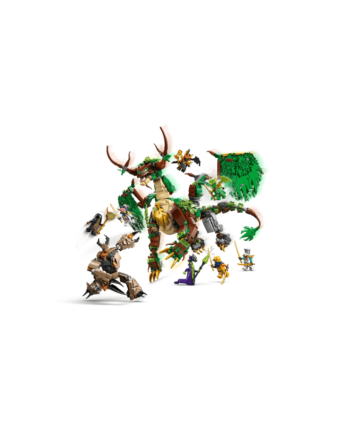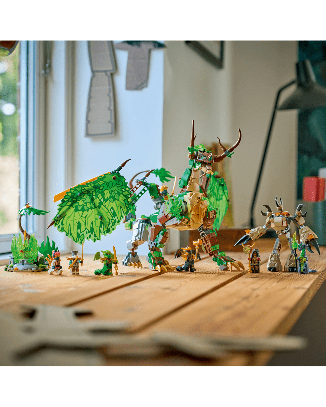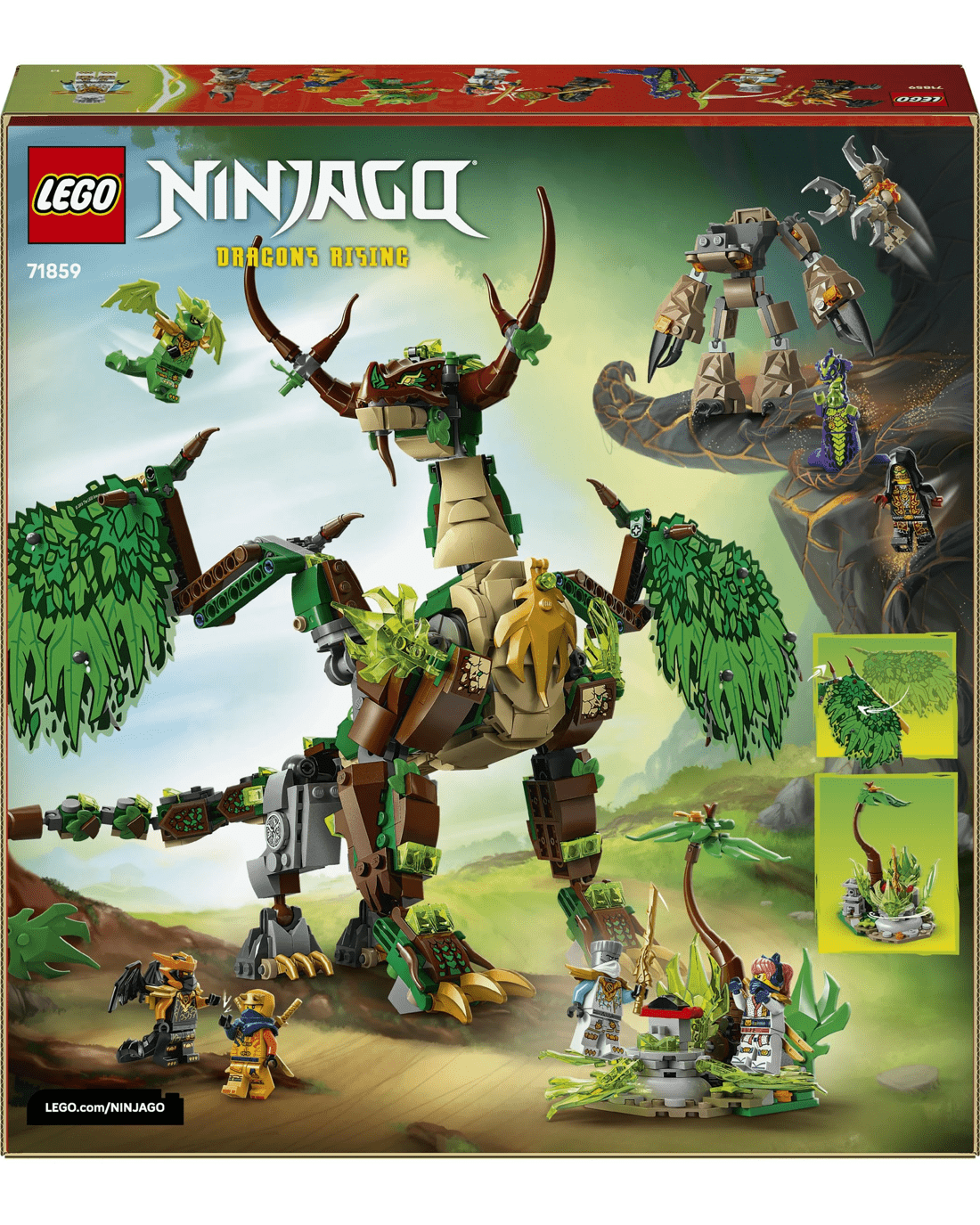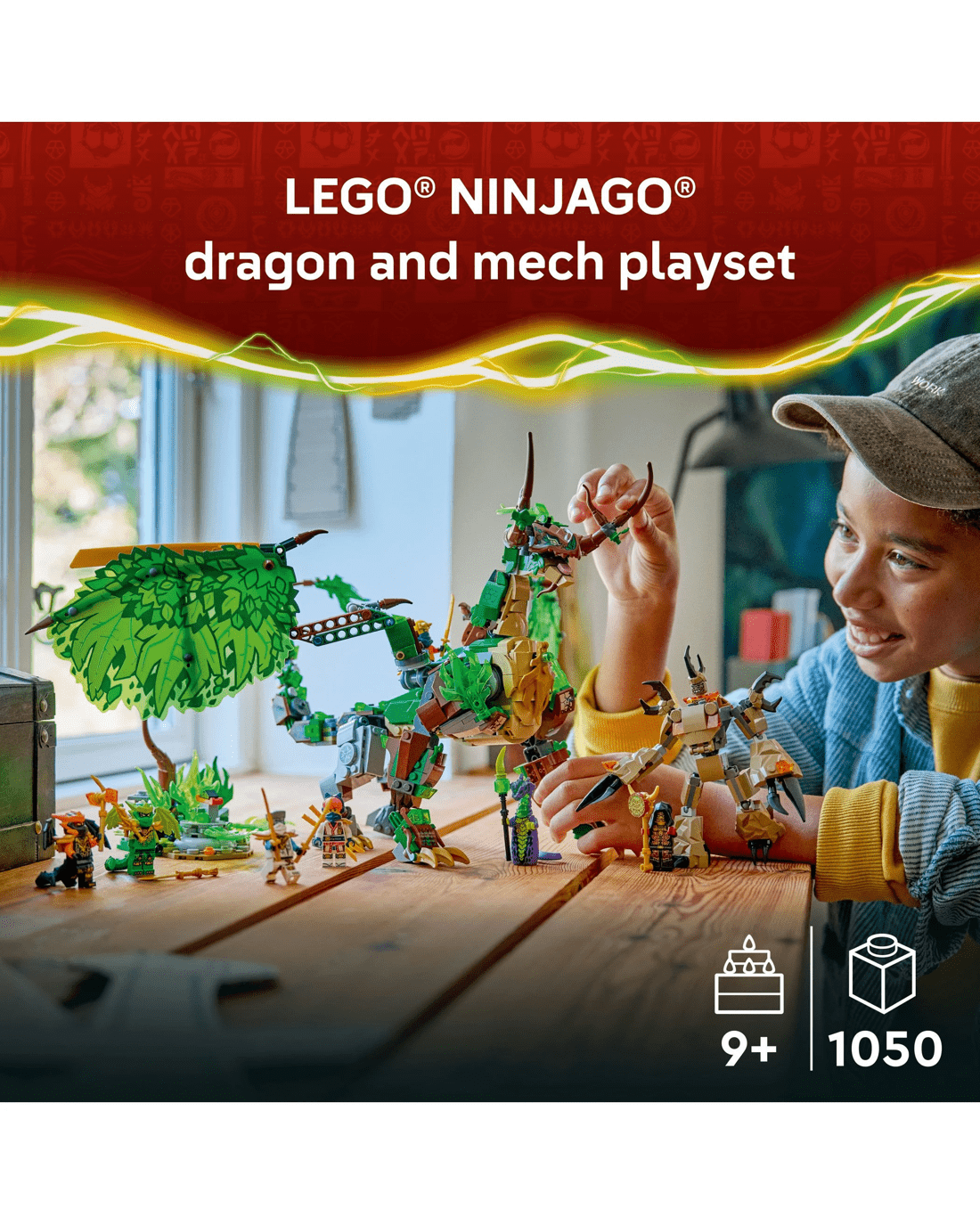 The playset includes a side build with a tree and a plant kids can spin round that hides a golden sword accessory, plus a posable mini mech toy with a cockpit for a minifigure. To role-play epic battles, there are eight minifigures: ninja Zane, Sora, Arin, dragon form Lloyd and dragon form Cole and the villainous trio of Acid Monster, Earth Monster and Loyalist Leader.