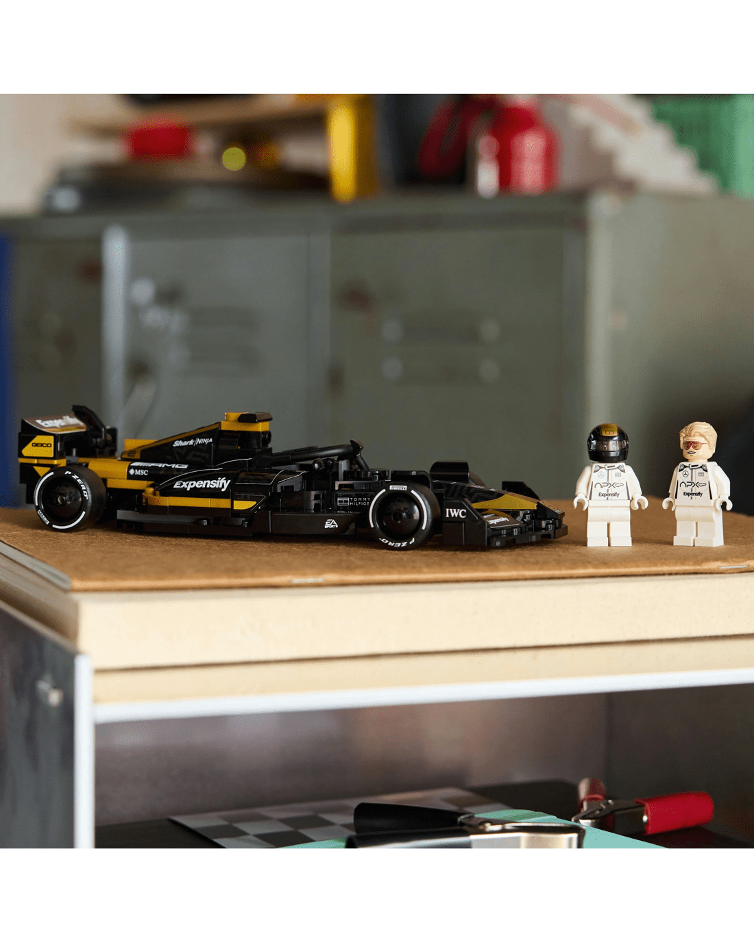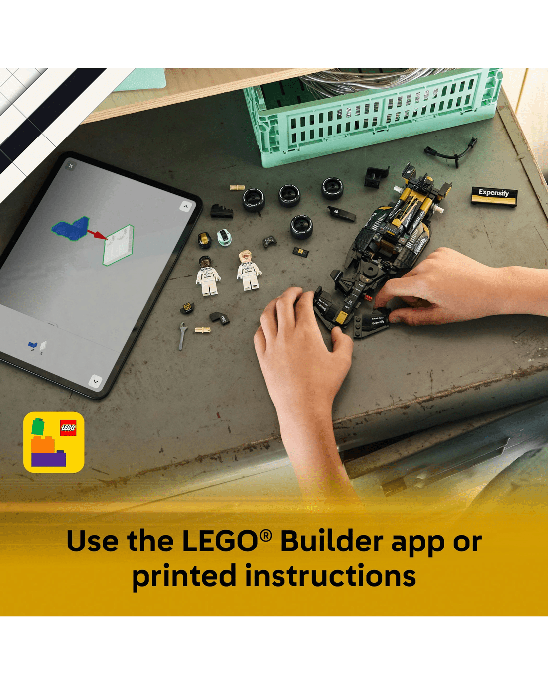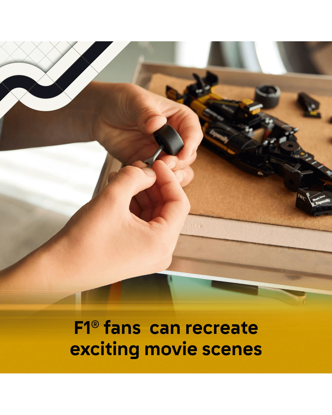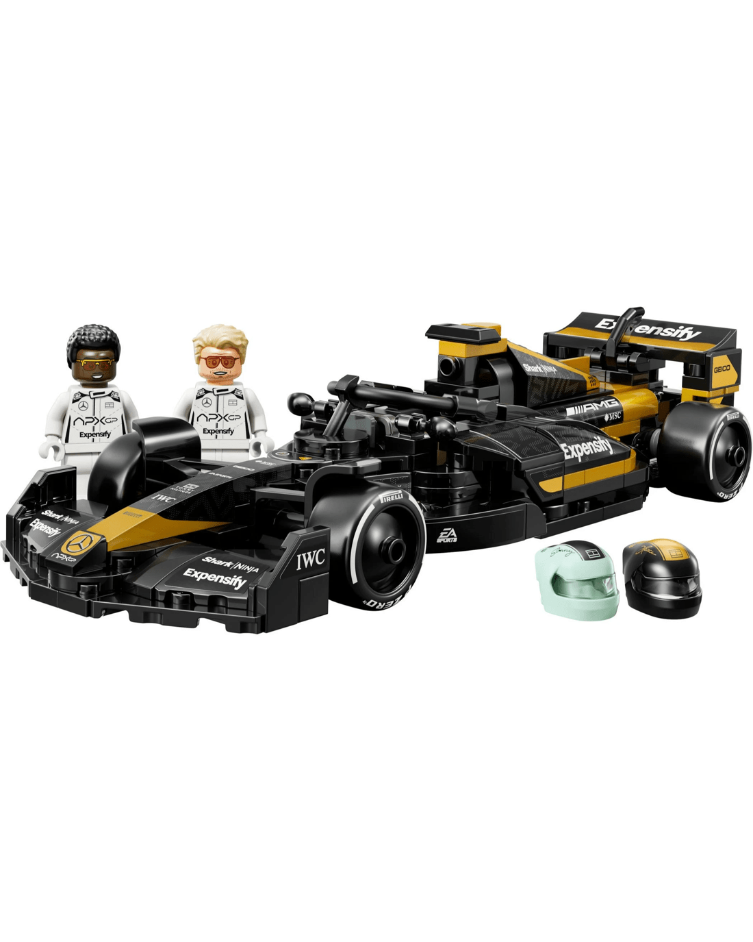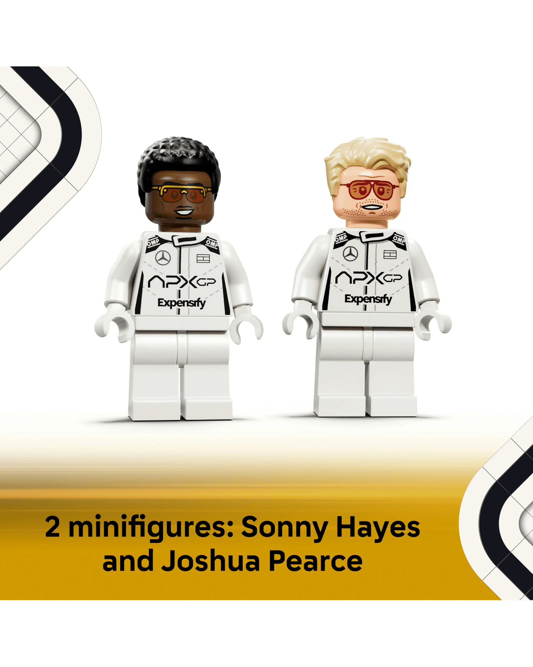 This F1 toy car features design details from the movie car including its black-and-gold livery, sponsor stickers and wider rear tyres imprinted with 'Pirelli'.The race car set also comes with two F1 driver minifigure characters from the movie: Sonny Hayes and Joshua Pearce, each with individual helmets featuring their signature, a wig and a wrench that can also be used to apply stickers and separate bricks.