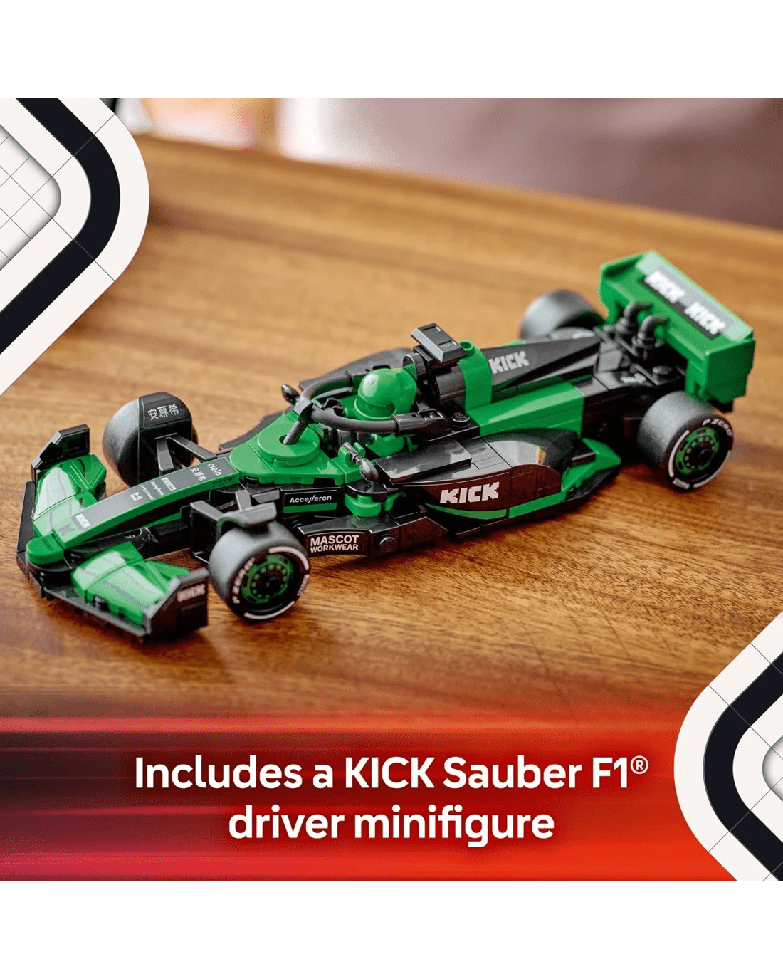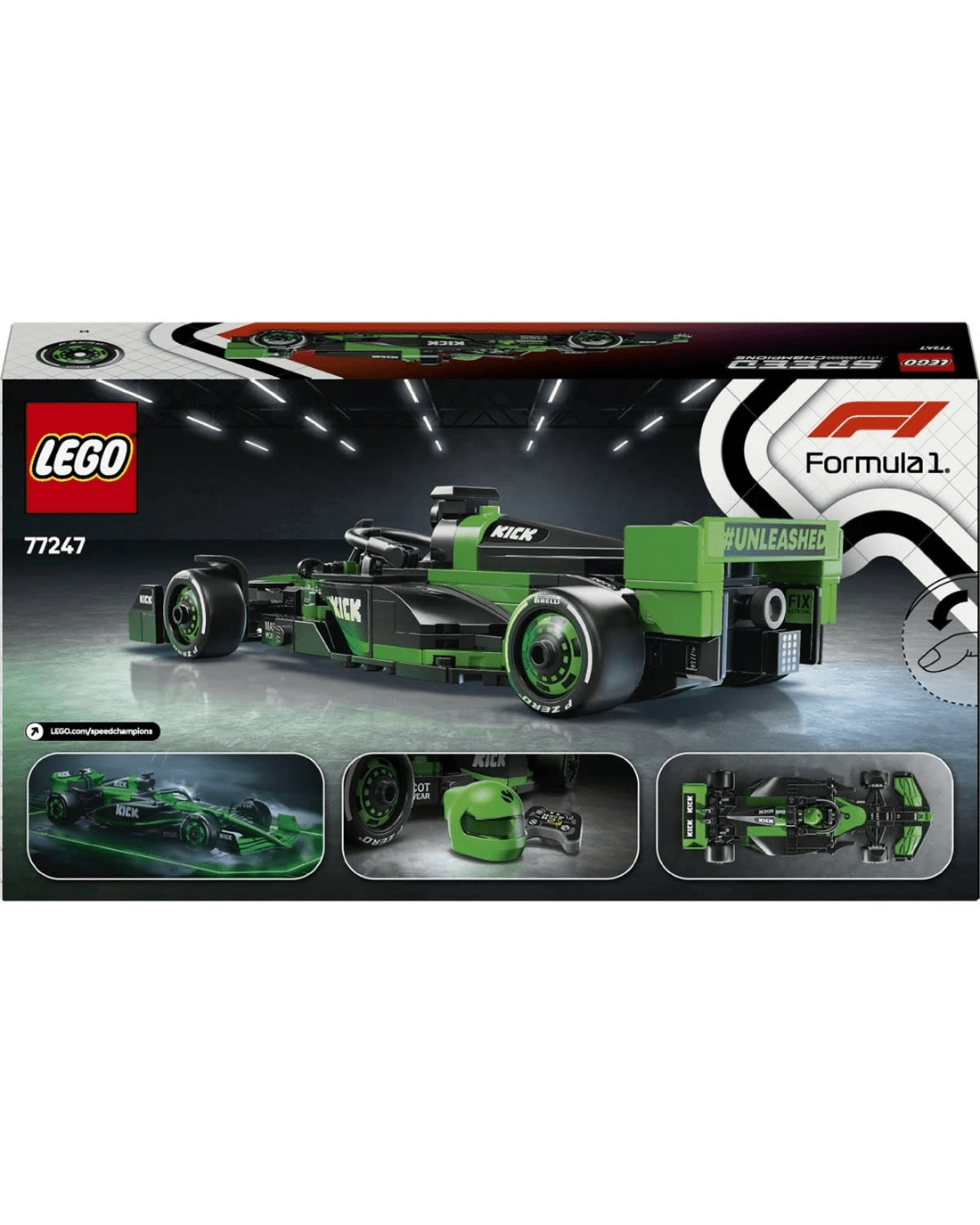 The F1 toy car features a cockpit that opens by lifting the halo bar, a rear wing, wishbone suspension, sponsor stickers and wider rear tyres imprinted with 'Pirelli'. The buildable race car also comes with a driver minifigure wearing a KICK Sauber F1 Team outfit and a winged helmet to place inside the cockpit.