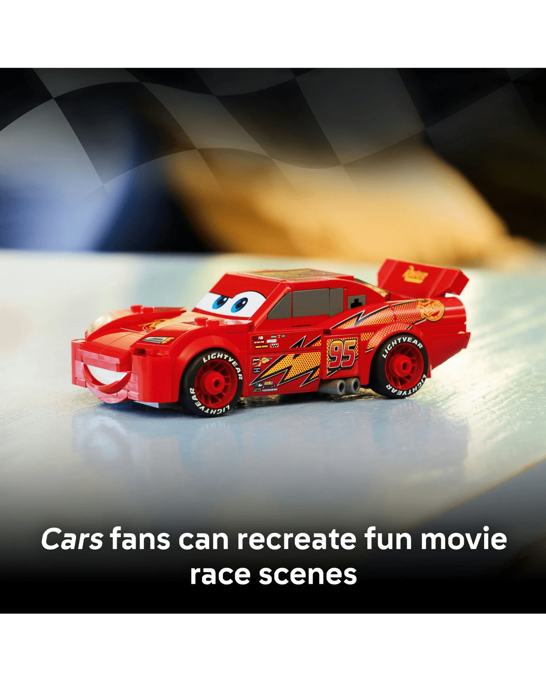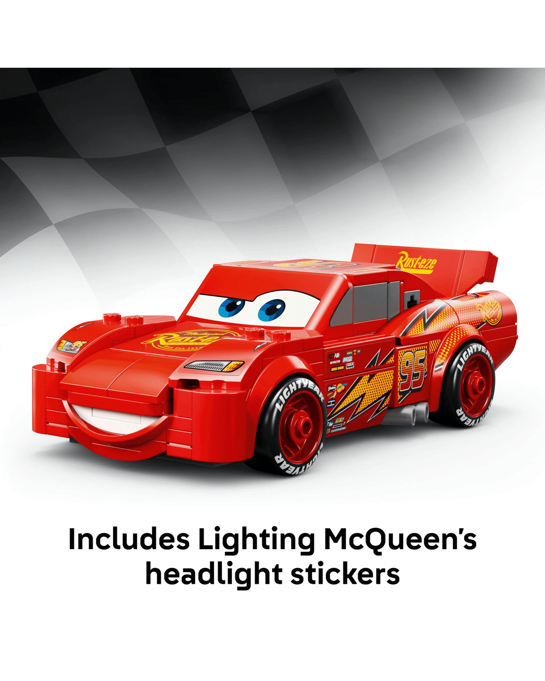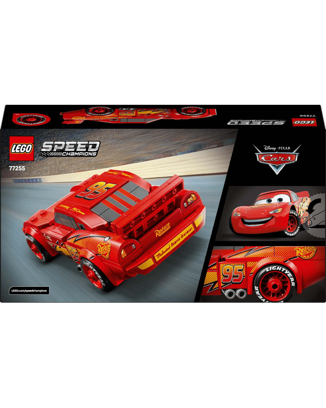 The Disney model features Lightning McQueen's famous yellow-and-orange lightning bolt, number 95, Rust-Eze sponsor logo, tyres imprinted with 'Lightyear' and his famous headlight stickers. The car toy is also the only Speed Champions model with a detailed undercarriage so kids can enjoy extra play value.