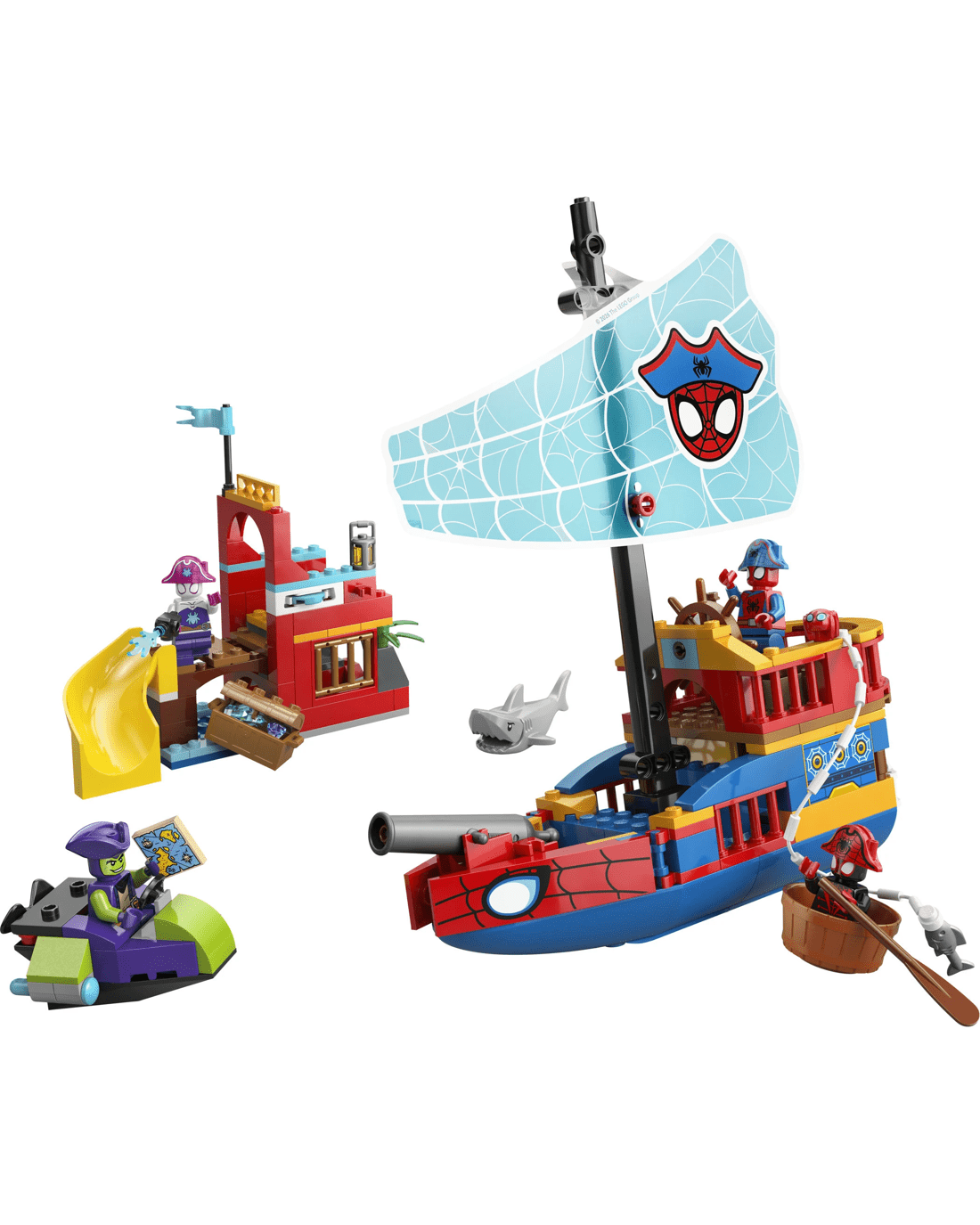 Set sail for imaginative play aboard the Team Spidey Pirate Ship creative building toy with Spidey, Green Goblin, Ghost-Spider and Miles 'Spin' Morales. This building set offers a great way for boys, girls and kids to develop skills as they explore fun at sea and on Spider Island.