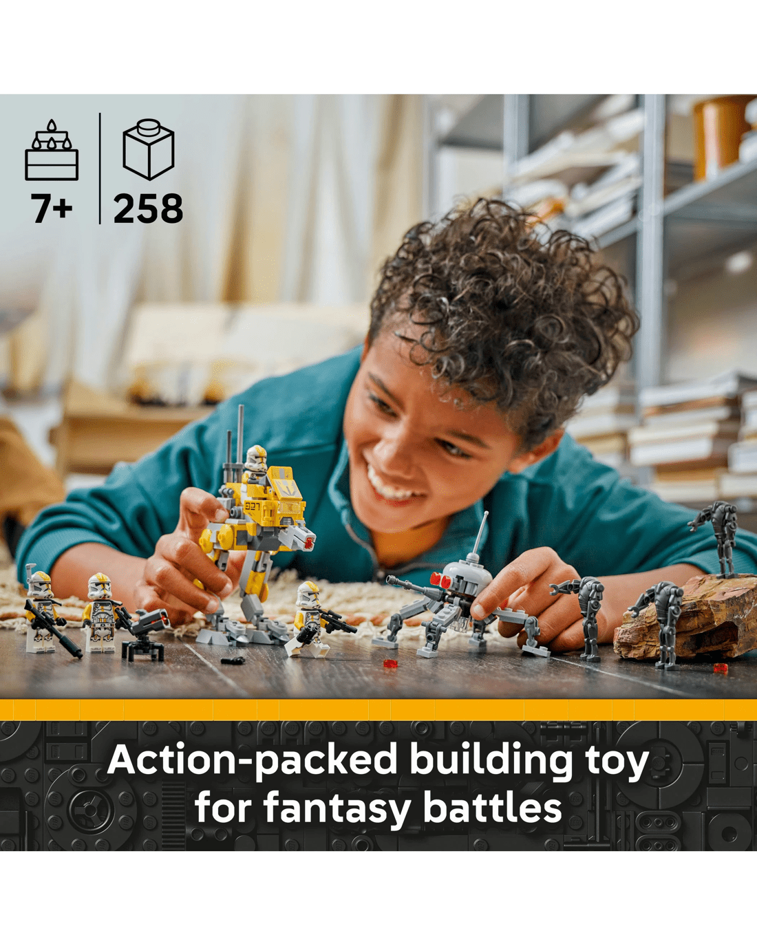 Build a platoon of 327th Star Corps Clone Troopers and take on the Super Battle Droids with this LEGO Star Wars: Revenge of the Sith Battle Pack set for kids. It features four LEGO Star Wars minifigures of Clone Troopers in their iconic 327th Star Corps outfits and three Super Battle Droid LEGO figures. This Star Wars buildable playset also includes an AT-RT walker with a LEGO minifigure cockpit, a stud shooter and storage for a blaster and binoculars and a stud-shooter turret for Clone Troopers, while the Super Battle Droids have a Spider Droid to inspire epic play-battles.