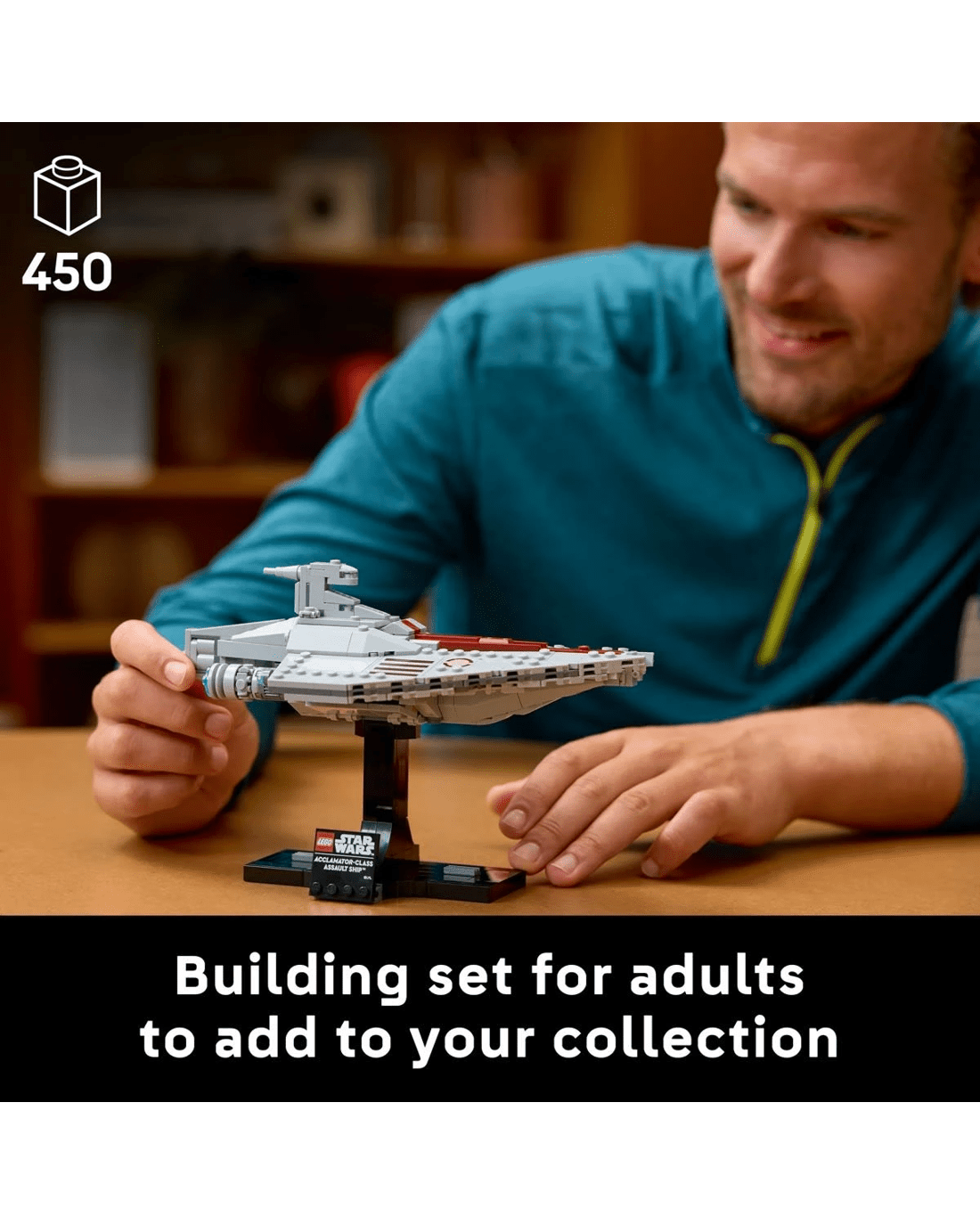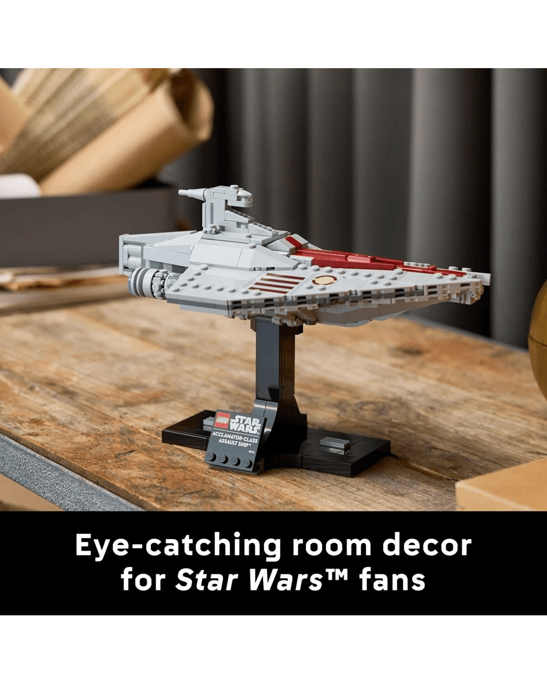 Be transported to the drama of the Battle of Geonosis as you build the first-ever LEGO Star Wars construction model of an Acclamator-Class Assault Ship. This Star Wars collectible build-and-display starship model captures many authentic details of the iconic vehicle seen in Star Wars: Attack of the Clones. Enjoy quality time immersing yourself in the complex, rewarding build and display your creation on the stand with a nameplate.