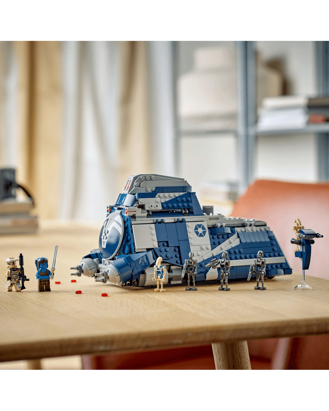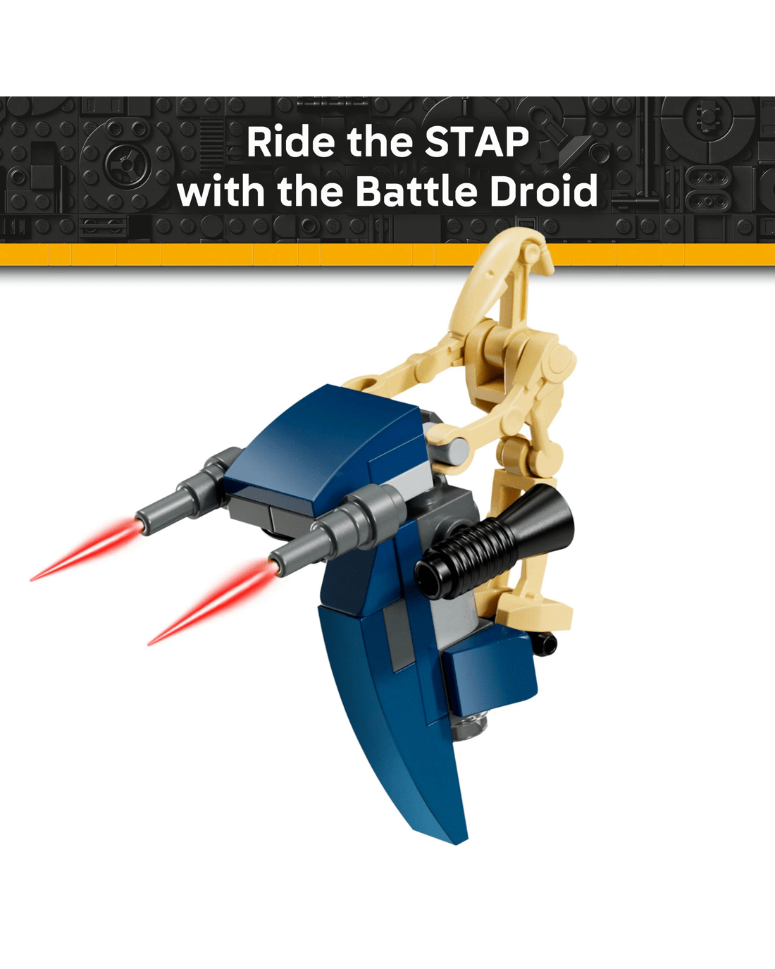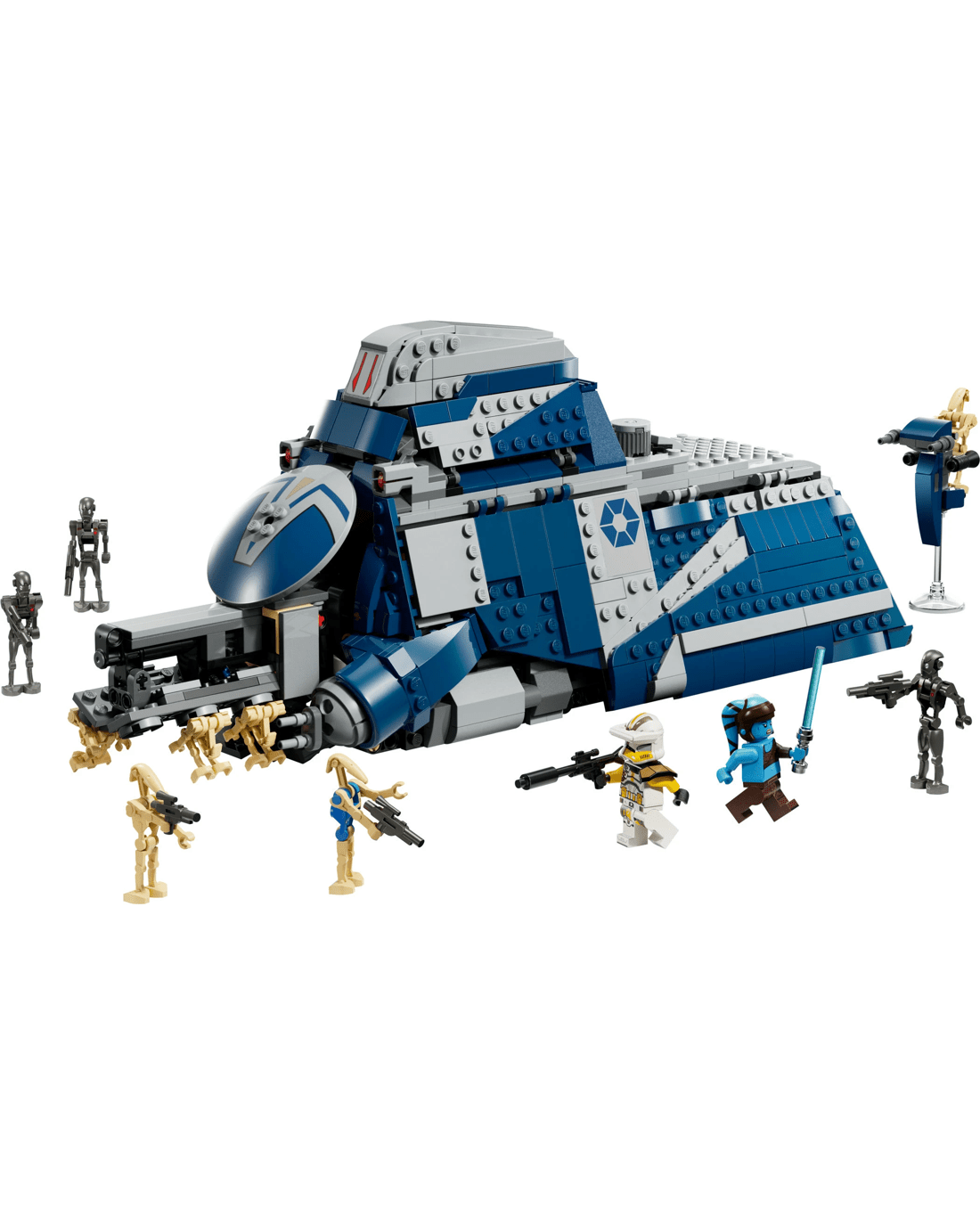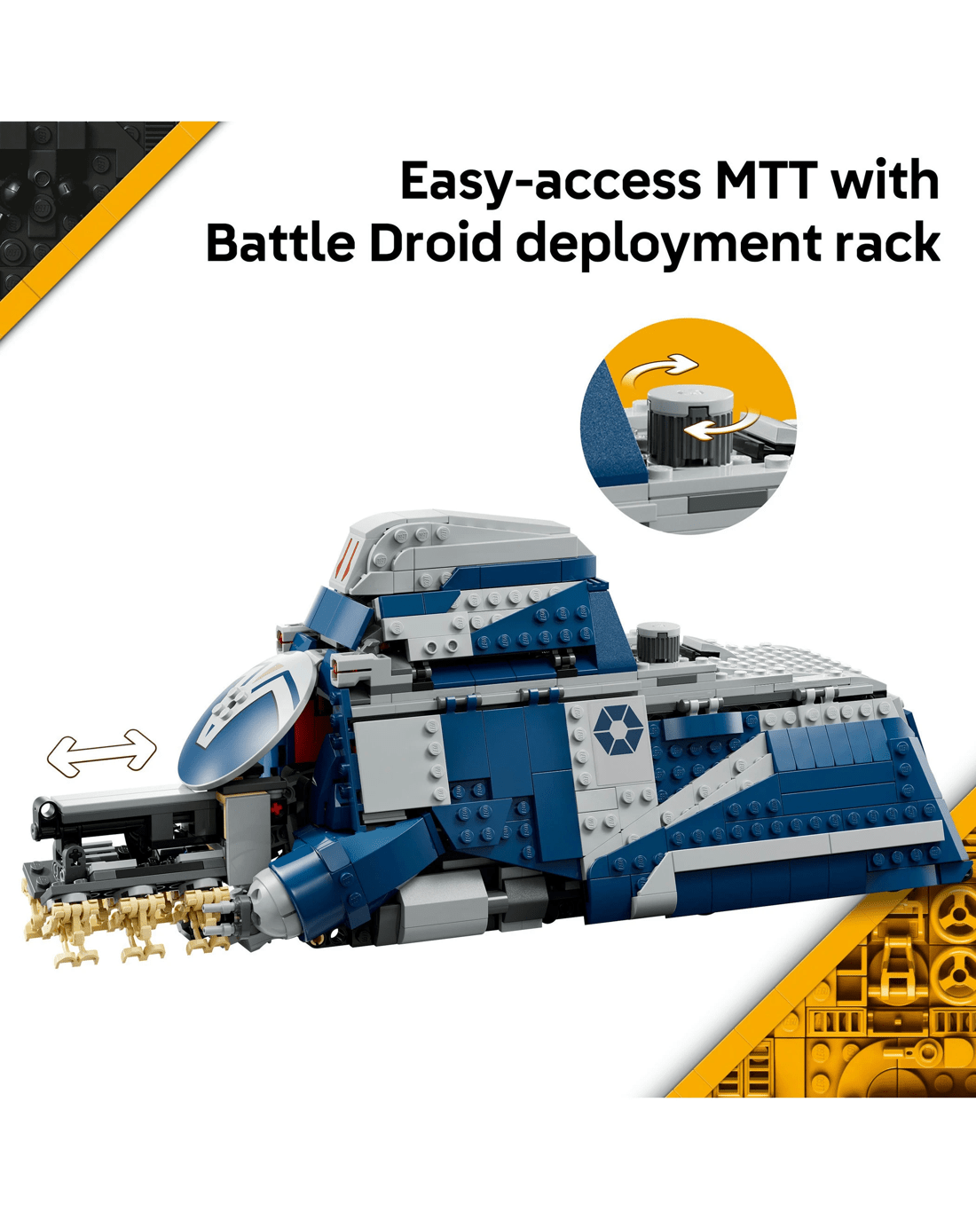 - Ready for action - The MTT has hidden wheels for smooth movement, a pilot cockpit, 2 stud shooters, a STAP speeder in the rear compartment and fold-up side panels to access interior details