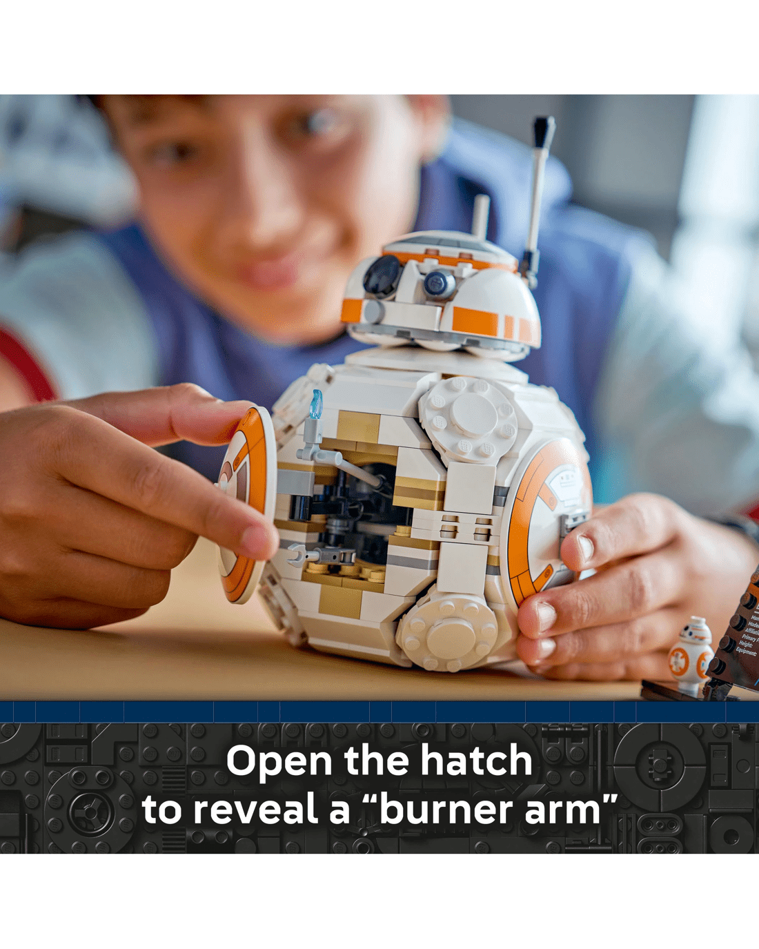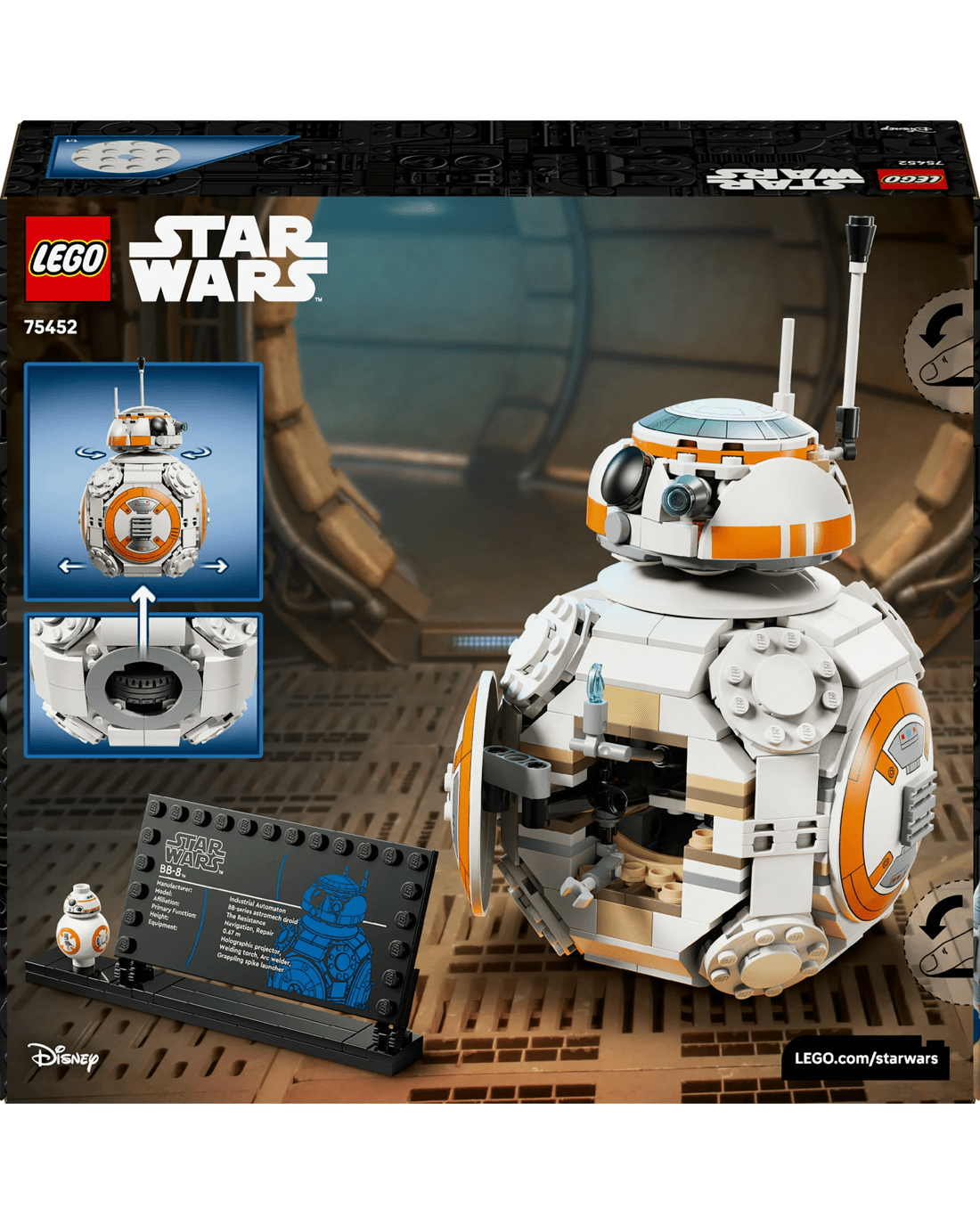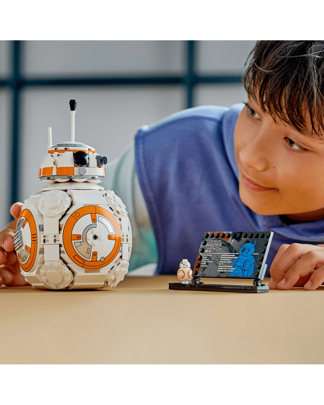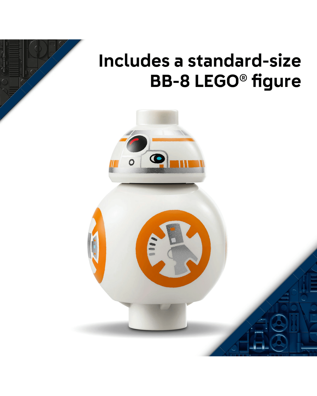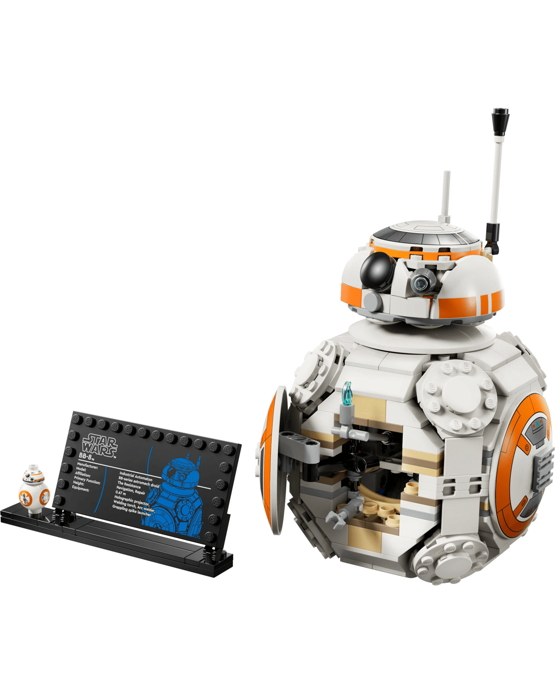 - BB-8 LEGO Figure- Display the main buildable toy model with the BB-8 info plaque and standard-sized BB-8 LEGO figure