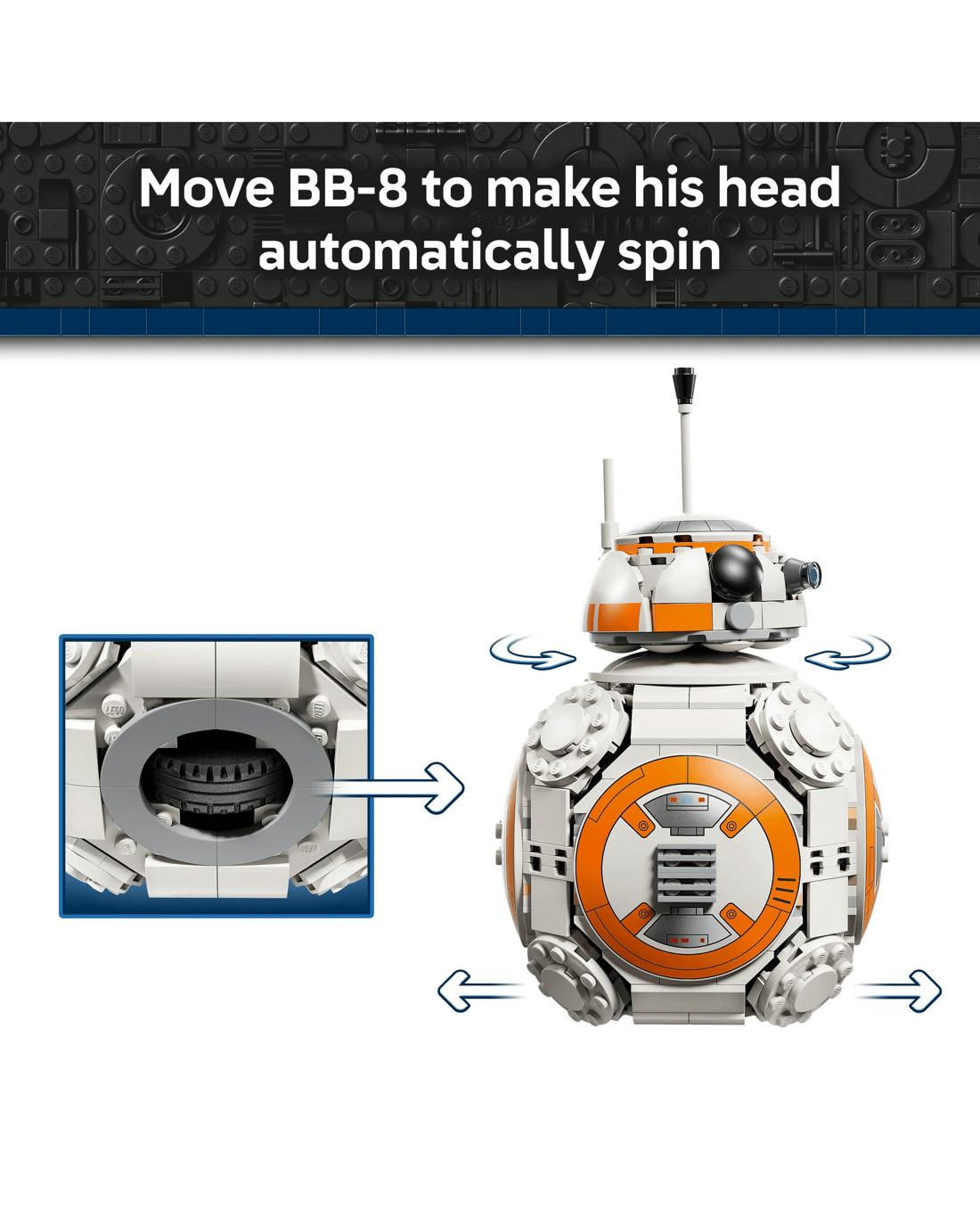 - Dynamic Display - Move BB-8 across a flat surface to make his head automatically spin around in random directions