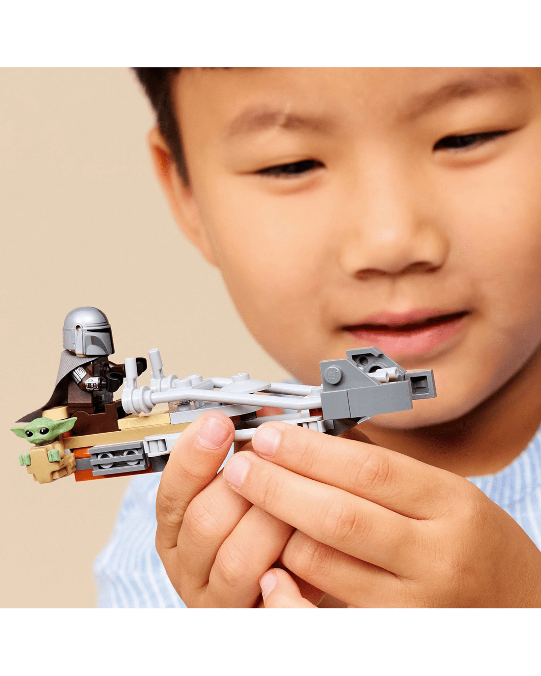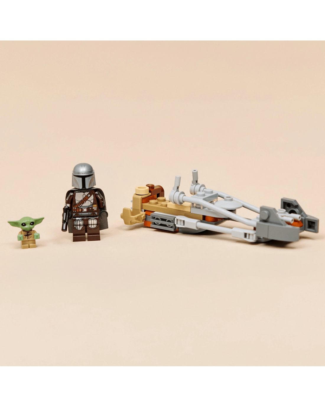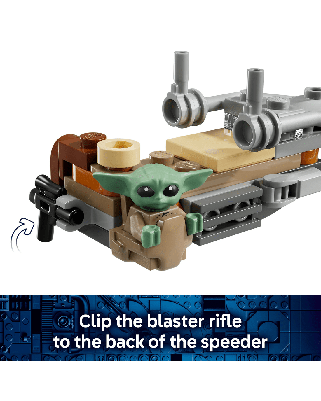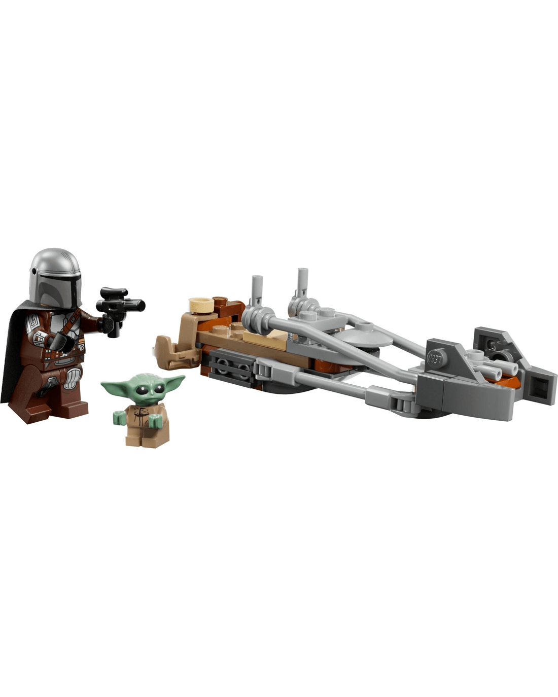 - Speeder Bike - Attach The Mandalorian's blaster rifle to the back of the speeder bike, and place him in the driver's seat with Grogu alongside in the attached satchel