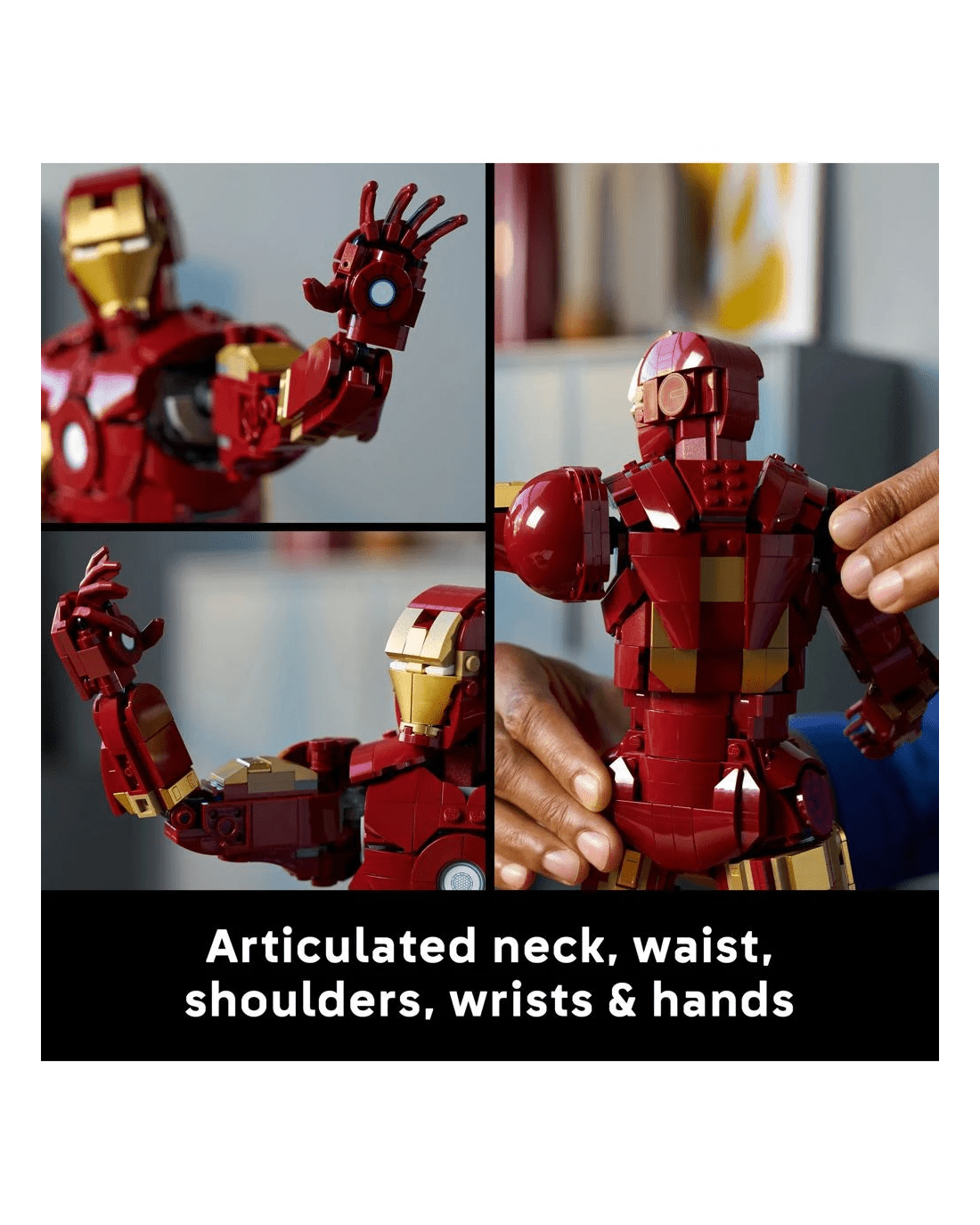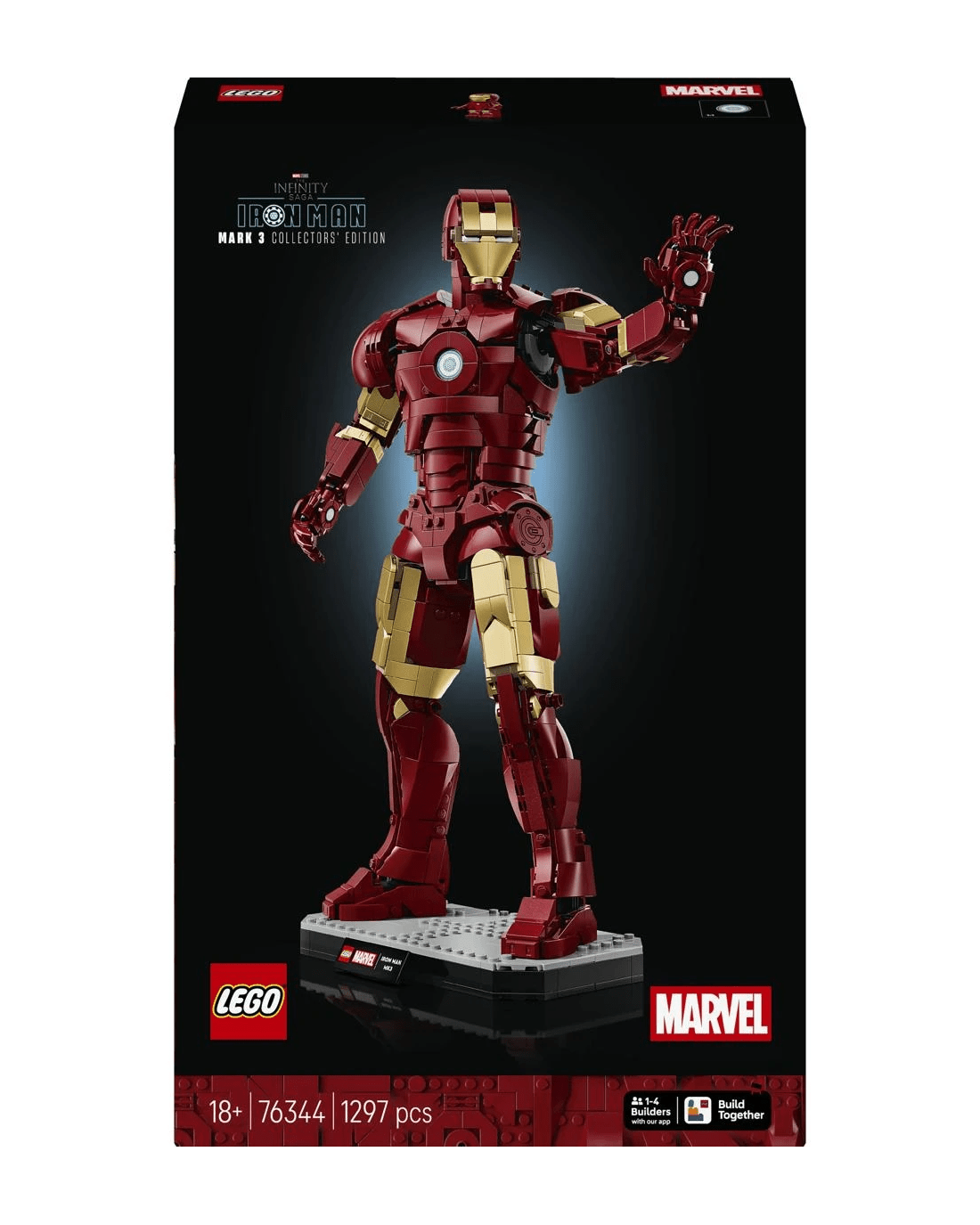 Put the authentically detailed Iron Man Mark three armour into dynamic display poses by repositioning the jointed neck, waist, shoulders, wrists and hands. The LEGO Marvel figure is decorated with gold-lacquered accents and stands on a sturdy base with a name plaque, creating a stunning piece of Super Hero decor. As an extra treat, the set comes with an Iron Man minifigure, who’s also ready for action in his Mark three armour. Builders can download the LEGO Builder app for a collaborative Build Together experience with friends and family. Building set contains 1,297 pieces.