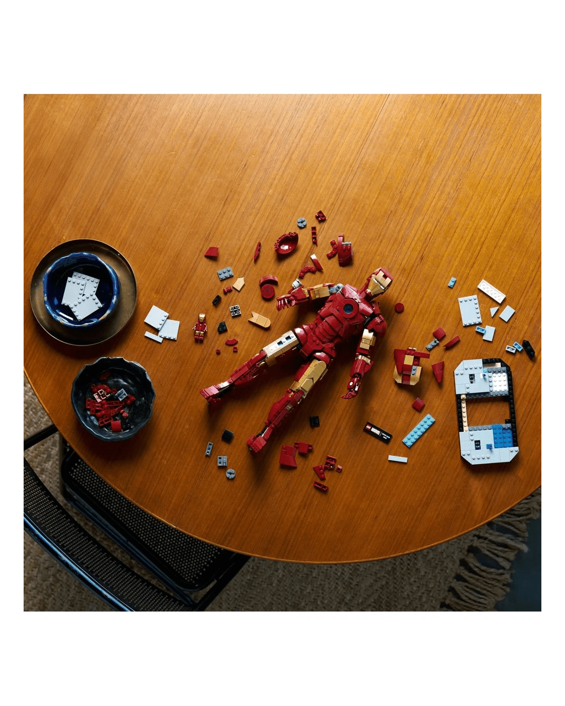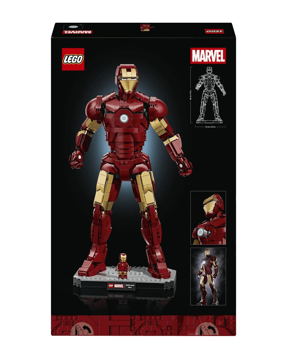 - Dimensions -This 1,297-piece building set’s Iron Man figure stands over 38cm tall, 21cm wide and 11cm deep