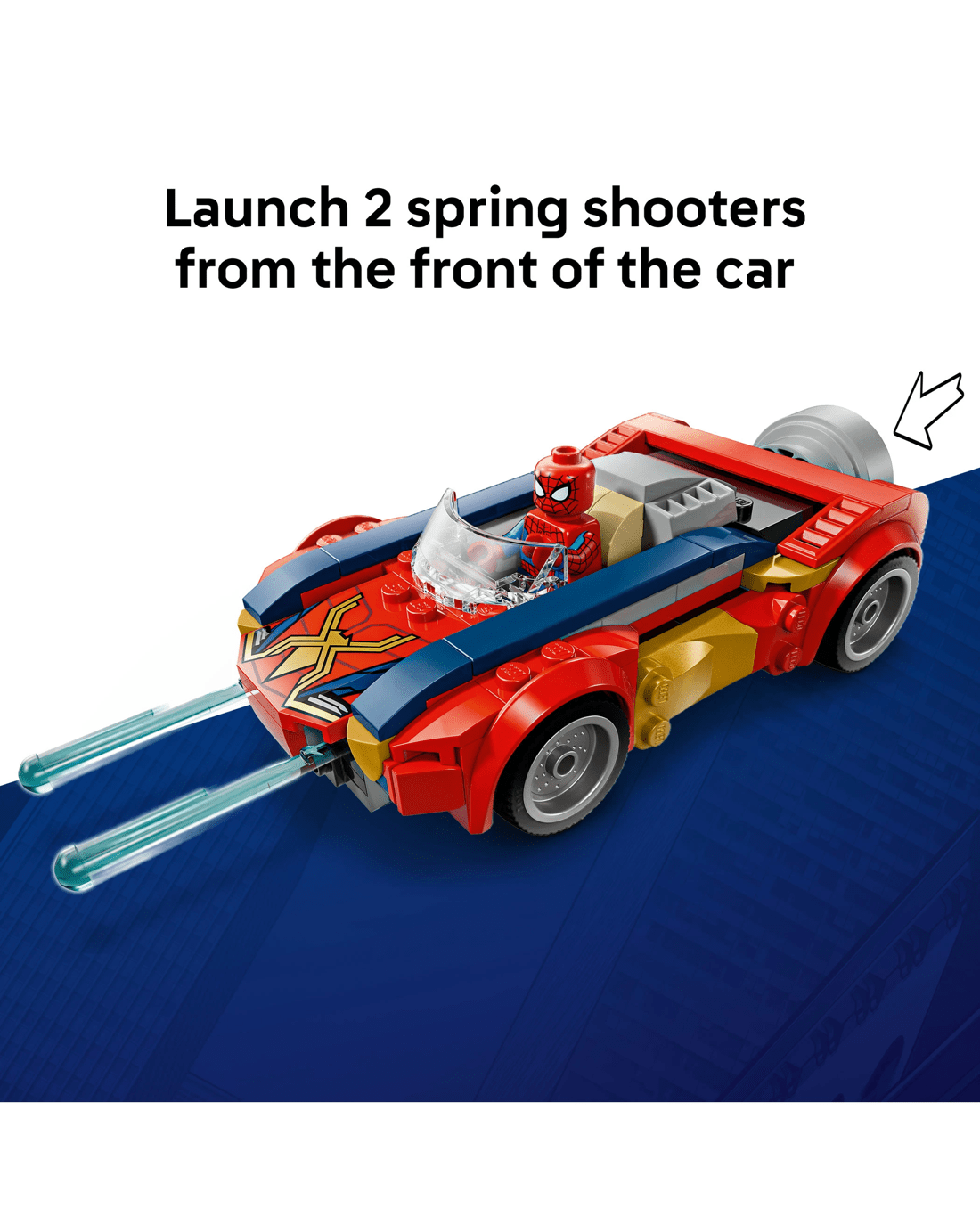 - Epic Battle Action - Put a high speed Super Hero showdown into kids’ hands with Spider-Man’s car, featuring a trigger at the back to launch 2 spring shooters from the front