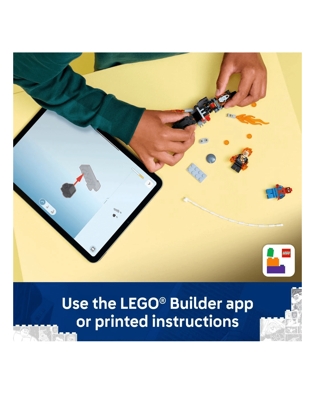 The Ghost Rider minifigure is depicted as a skeleton with flames streaming from his hands and head. His iconic motorcycle features two flaming exhaust pipes and two built-in stud shooters. The Spider-Man minifigure’s web-rope attaches to the motorcycle, offering endless role-play possibilities as the characters battle on and off the high-octane vehicle. This building set makes a great gift idea for the birthdays of young Super Heroes, LEGO builders and fans of collectable Spider-Man merchandise. And, with the LEGO Builder app, kids can build with confidence - zoom, rotate in 3D and track progress with easy-to-follow digital instructions. Building set contains 72 pieces.