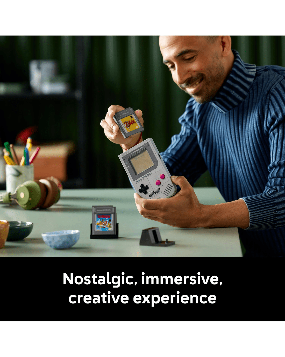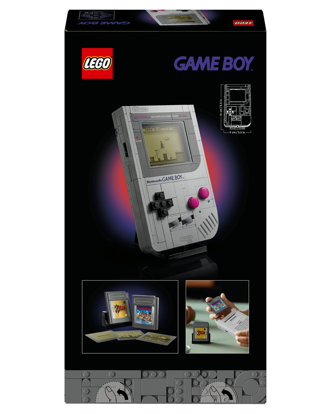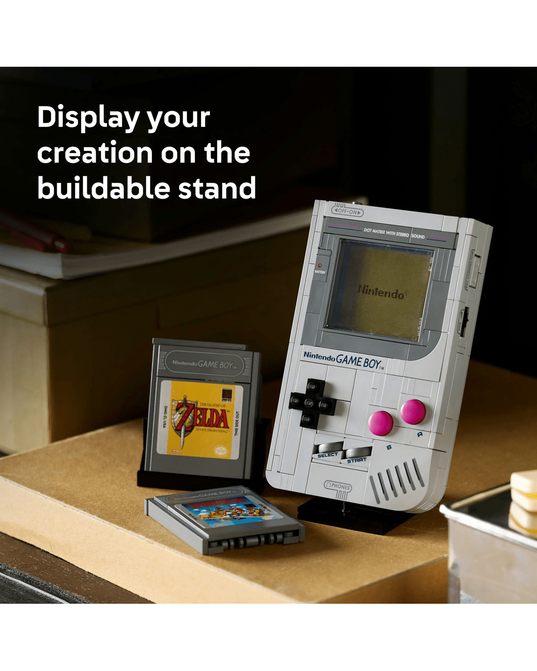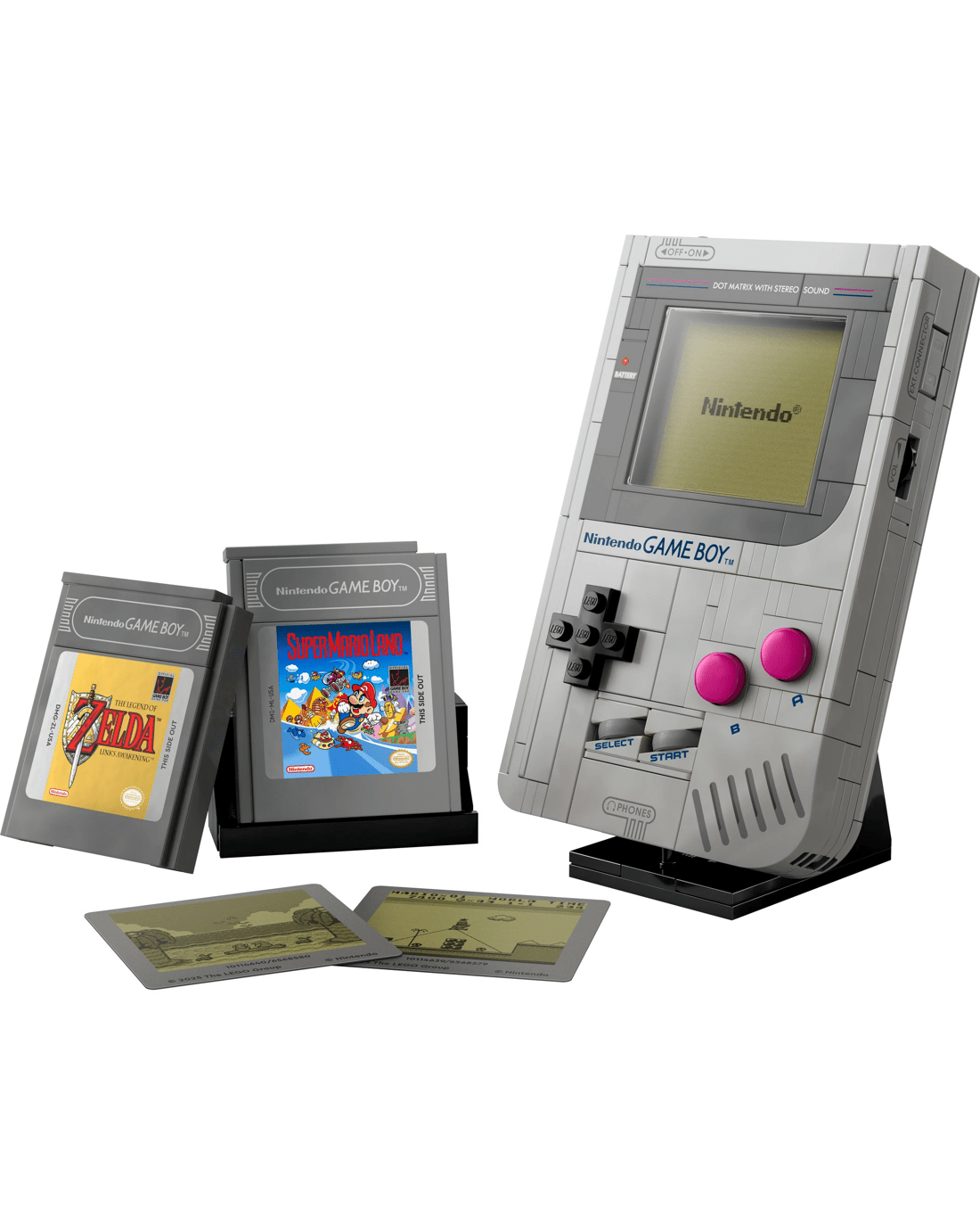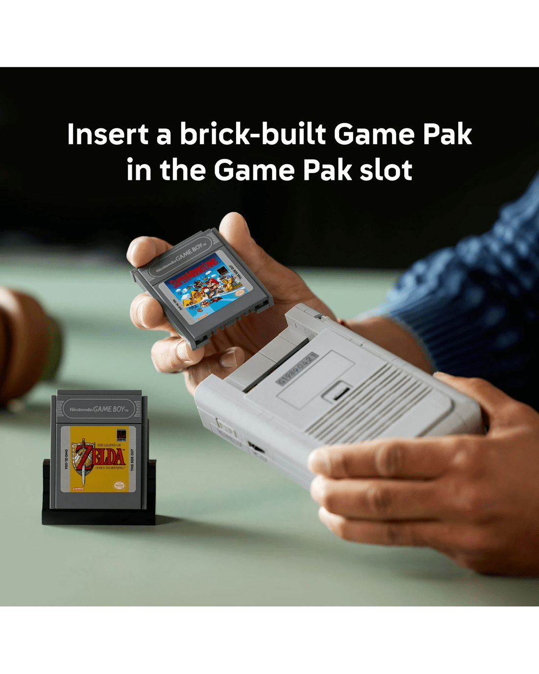 - Customise your display - Includes interchangeable, brick-built The Legend of Zelda: Link's Awakening or Super Mario Land Game Boy Game Paks and lenticular screens, plus a Nintendo start screen