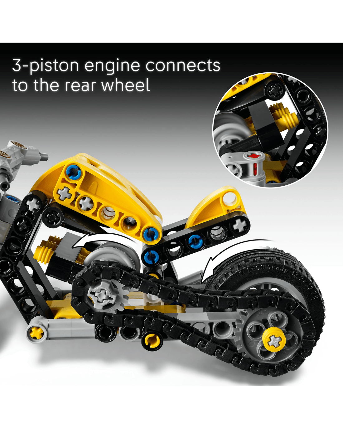 - Steering and Engine - This motorbike toy includes steering and a 3-piston engine that’s connected to the rear wheel with a chain