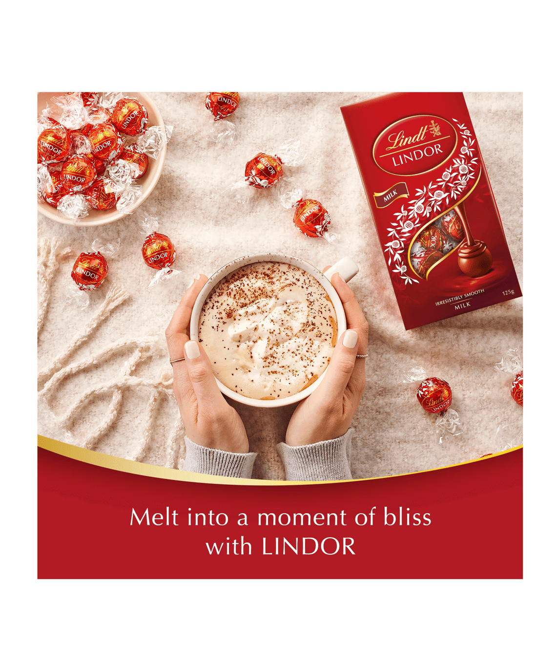 Experience bliss with LINDOR smooth melting milk chocolate. The Lindt Master Chocolatiers combine expertise and the finest ingredients to produce the perfectly round chocolate shell with an irresistibly smooth melting filling.