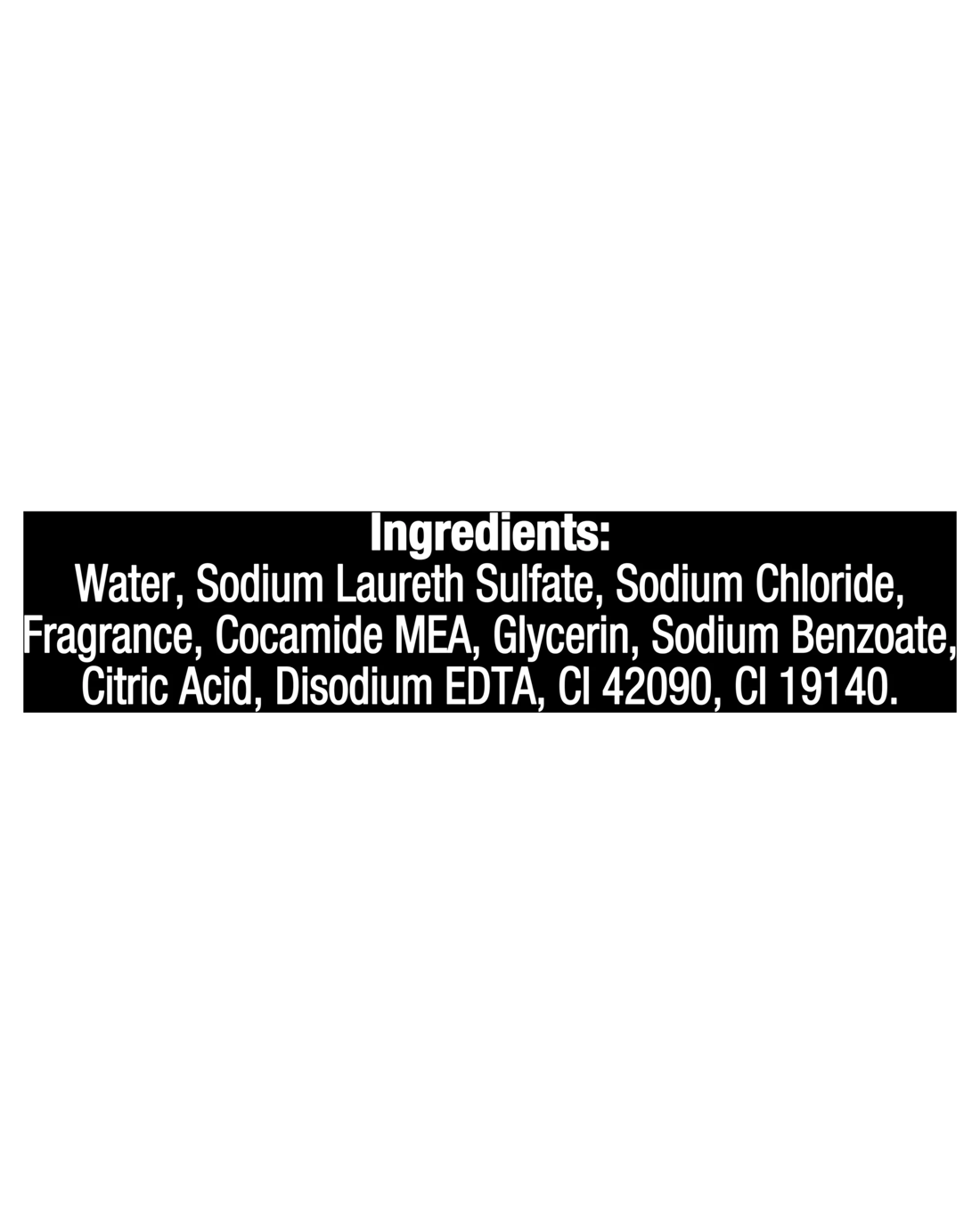 - Ingredients: Water, Sodium Laureth Sulfate, Sodium Chloride, Fragrance, Cocamide MEA, Glycerin, Sodium Benzoate, Citric Acid, Disodium EDTA, CI 42090, CI 19140
