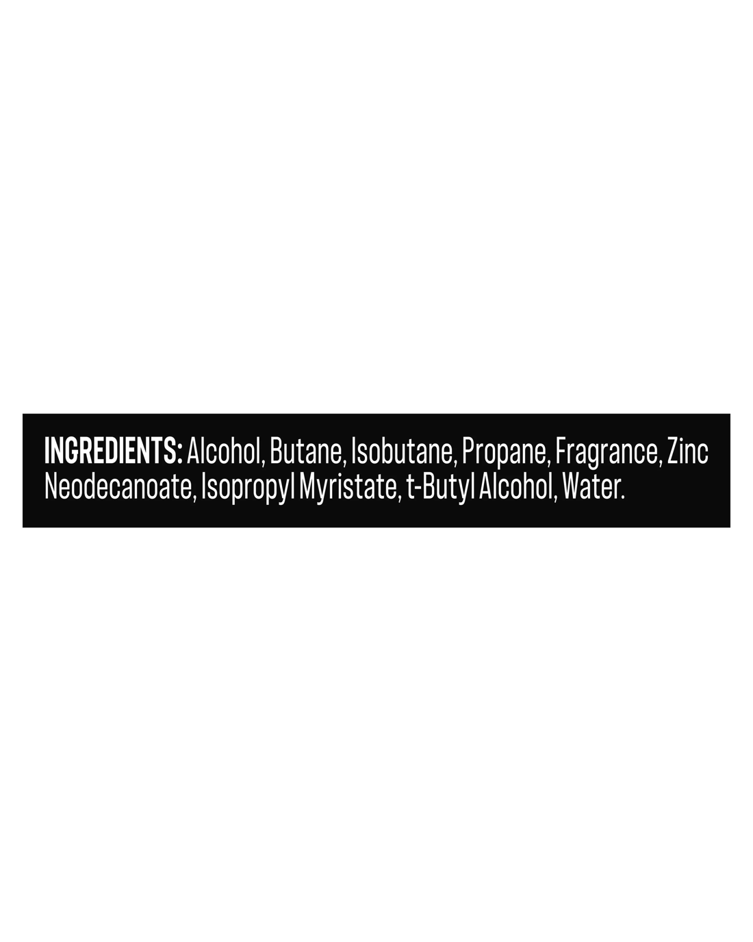 - Ingredients: Alcohol, Butane, Isobutane, Propane, Fragrance, Zinc Neodecanoate, Isopropyl Myristate, t-Butyl Alcohol, Water