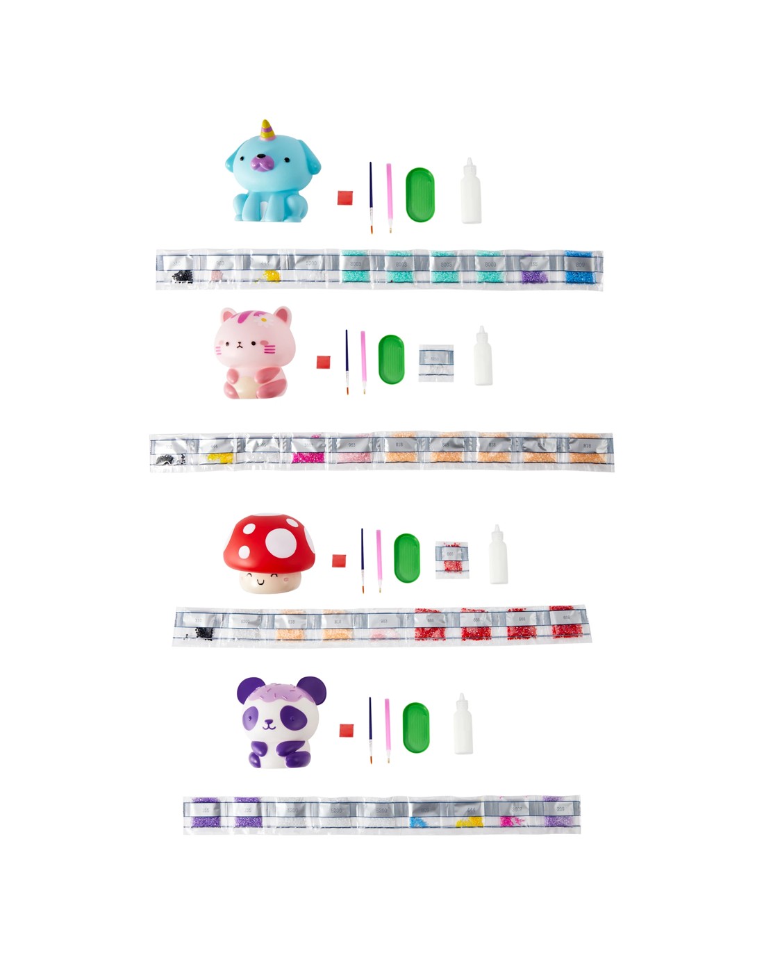 - 1 x 3D plastic figurine, 7 x bags of coloured gems, 1 x plastic tray, 1 x applicator pen, 1 x mini paint brush, 1 x tube of glue and 1 x wax