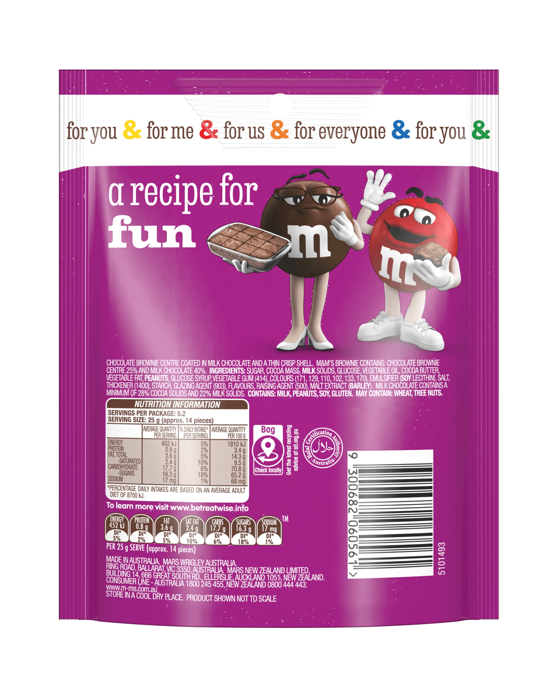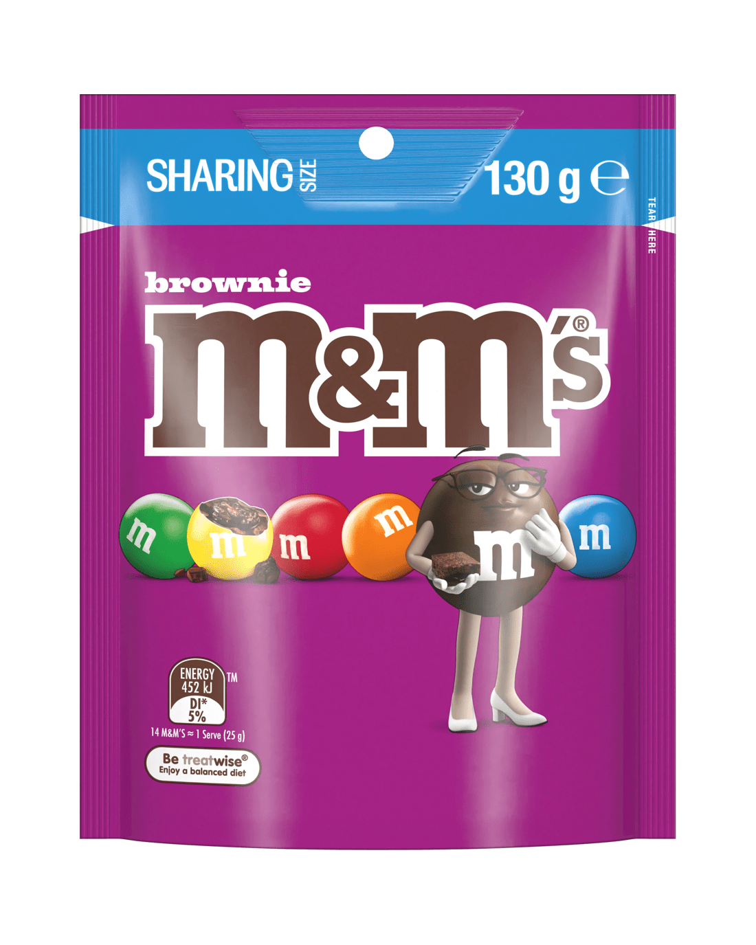 Call off the search! Because those deliciously fun chocolate snacks you’ve been looking for are right here in this pack of M&M’S Brownie! M&M’S Bite Size Chocolates are ideal as an on-the-go treat, in the workplace or as a chocolate snack for movie nights. M&M'S make boring meetings go faster, too! They will rocket YOU into fave person territory when you share them as chocolate treats and sprinkle their happy M&M'S Chocolate colours into baking recipes, popcorn TV snacks and over ice cream. Movies at your place? It starts with M&M’S Chocolates!